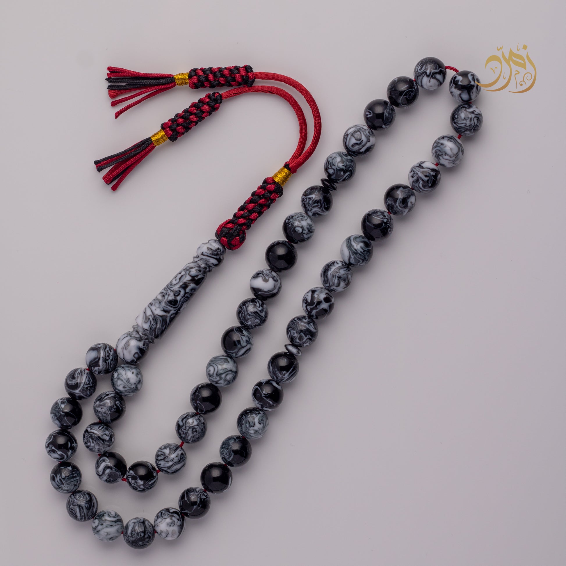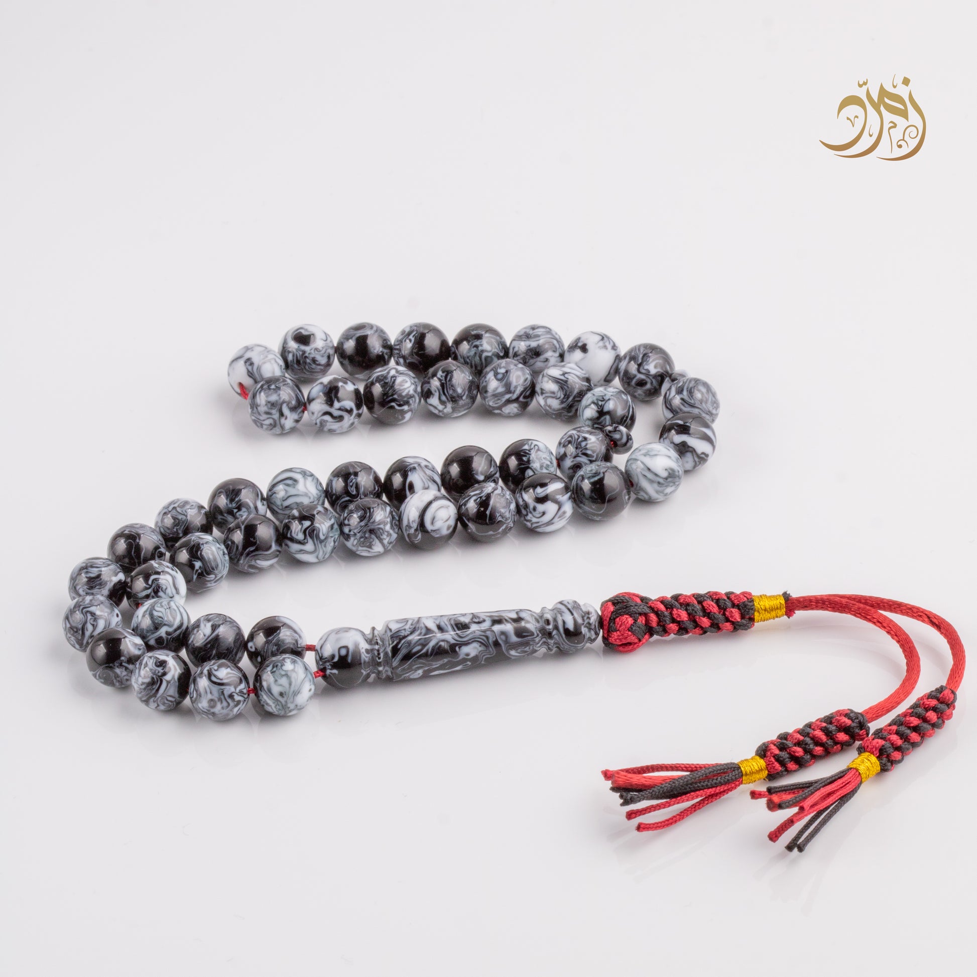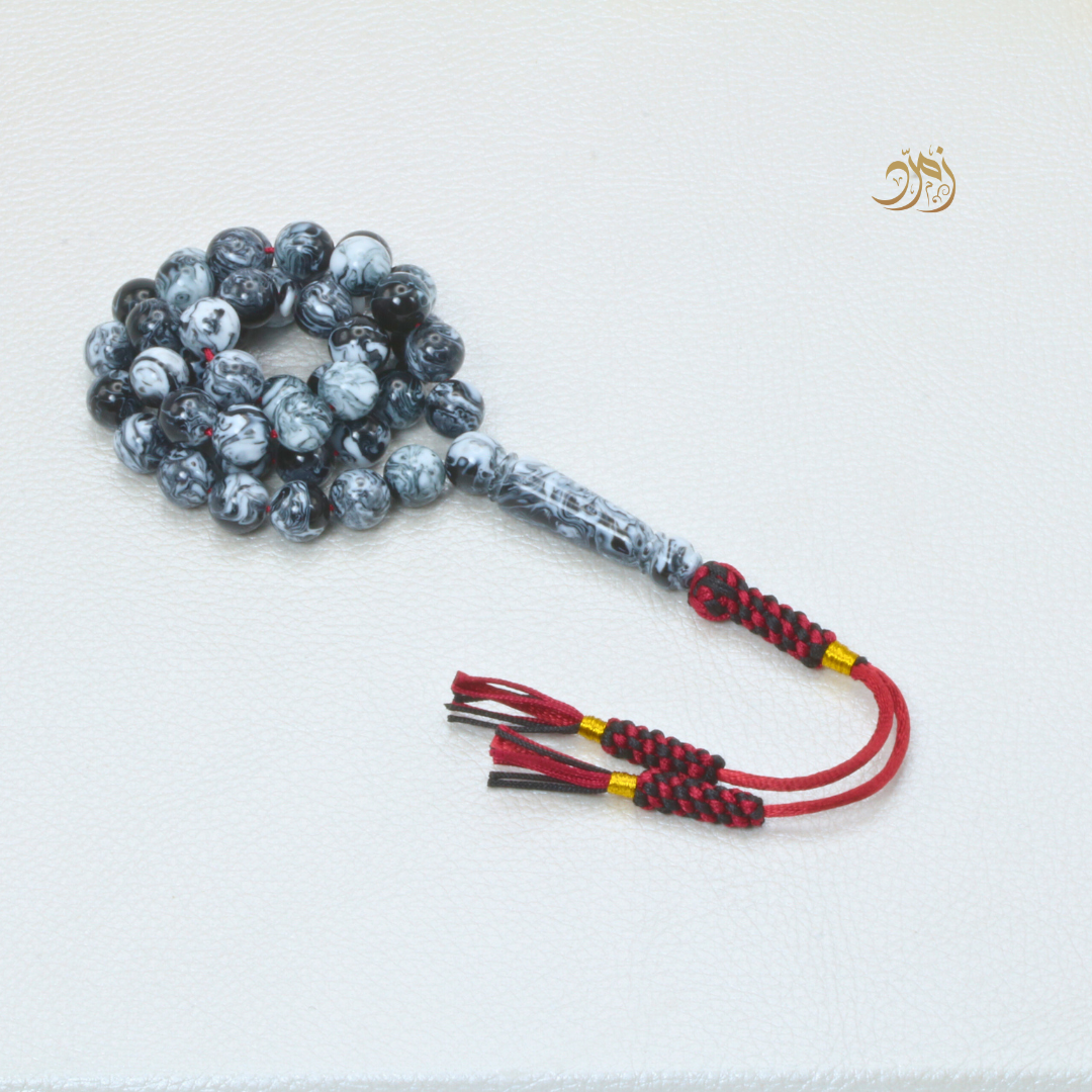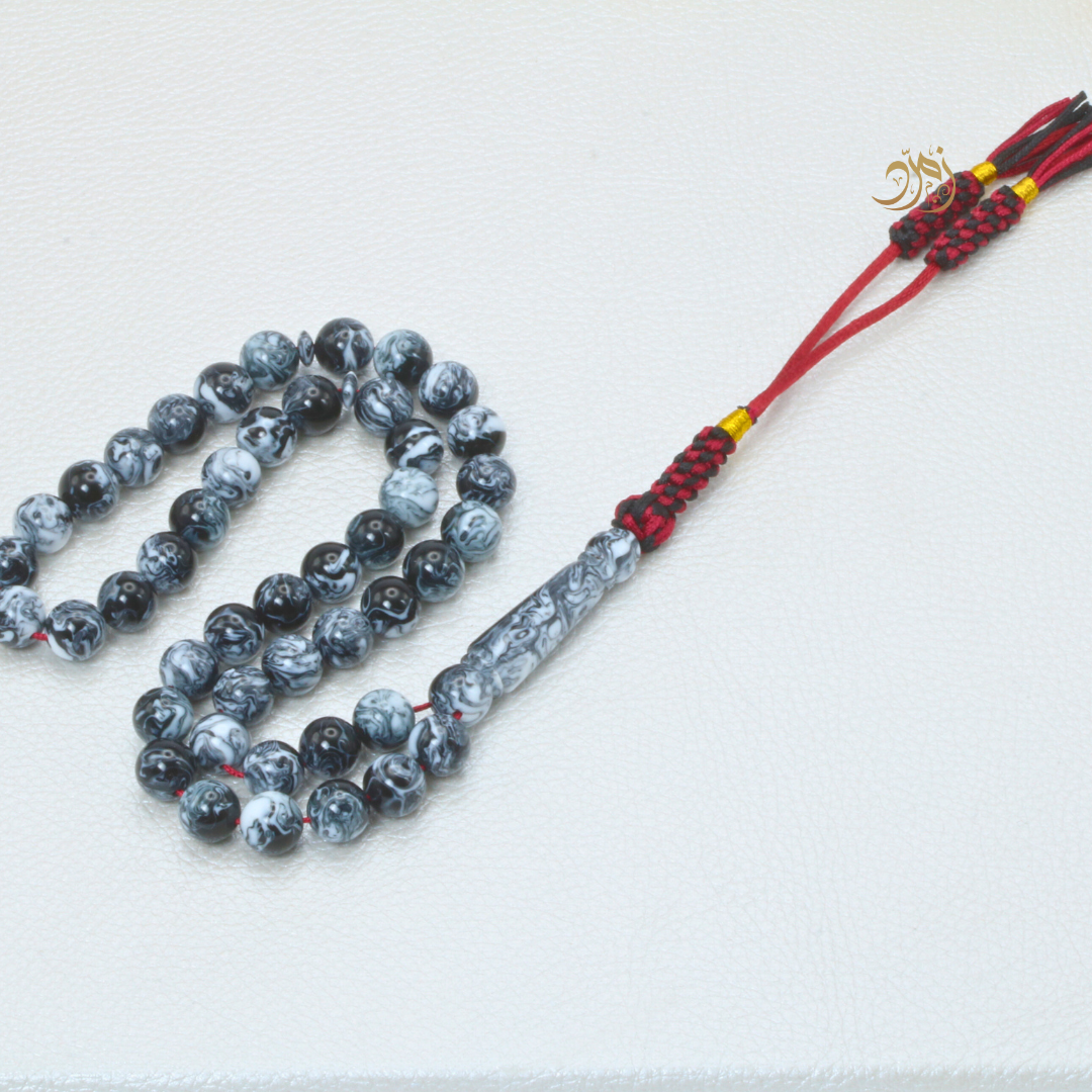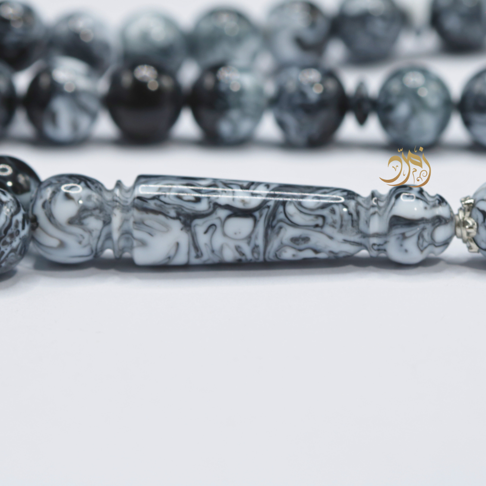 سبحة أنيقة مصنوعة من بكلايت عالي الجودة، بلون رصاصي ممزوج بنمط رخامي أسود وأبيض فريد من نوعه.