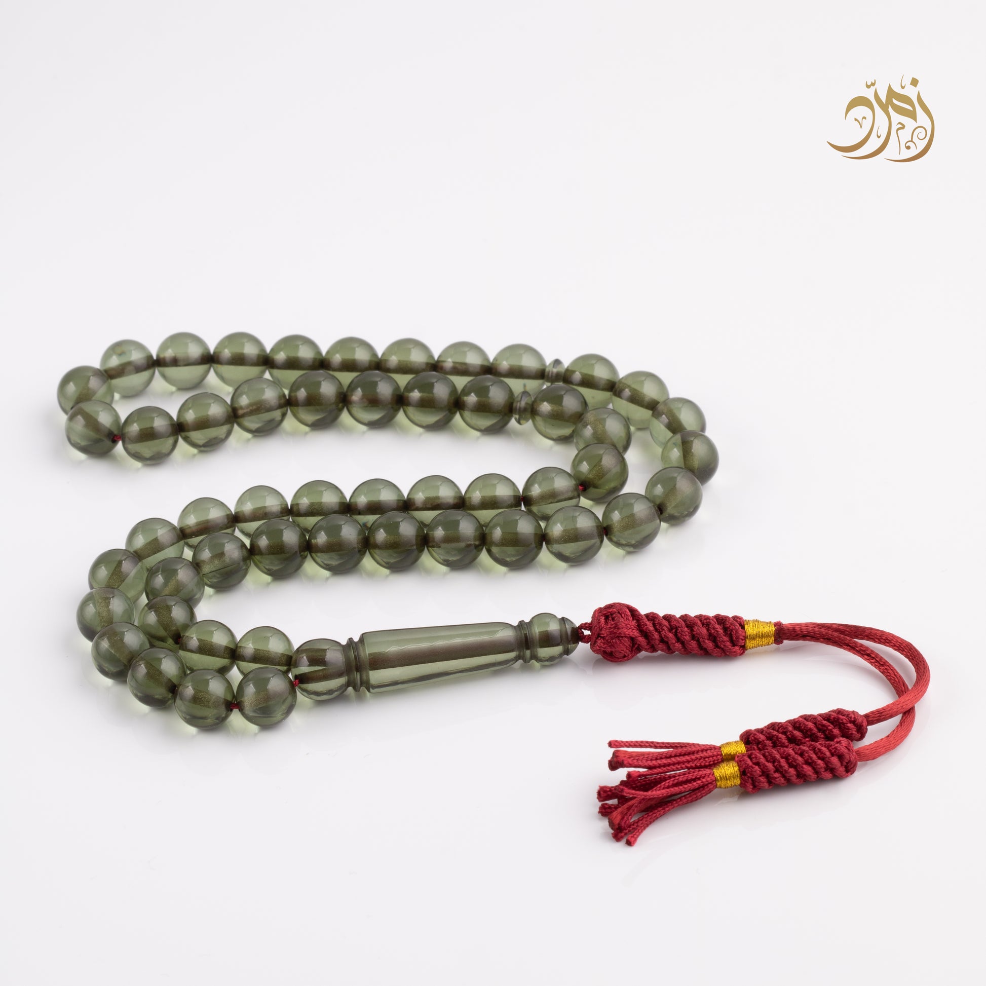 سبحة أنيقة مصنوعة من بكلايت بلون أخضر زيتوني شفاف يمنحها مظهراً هادئاً وراقياً.