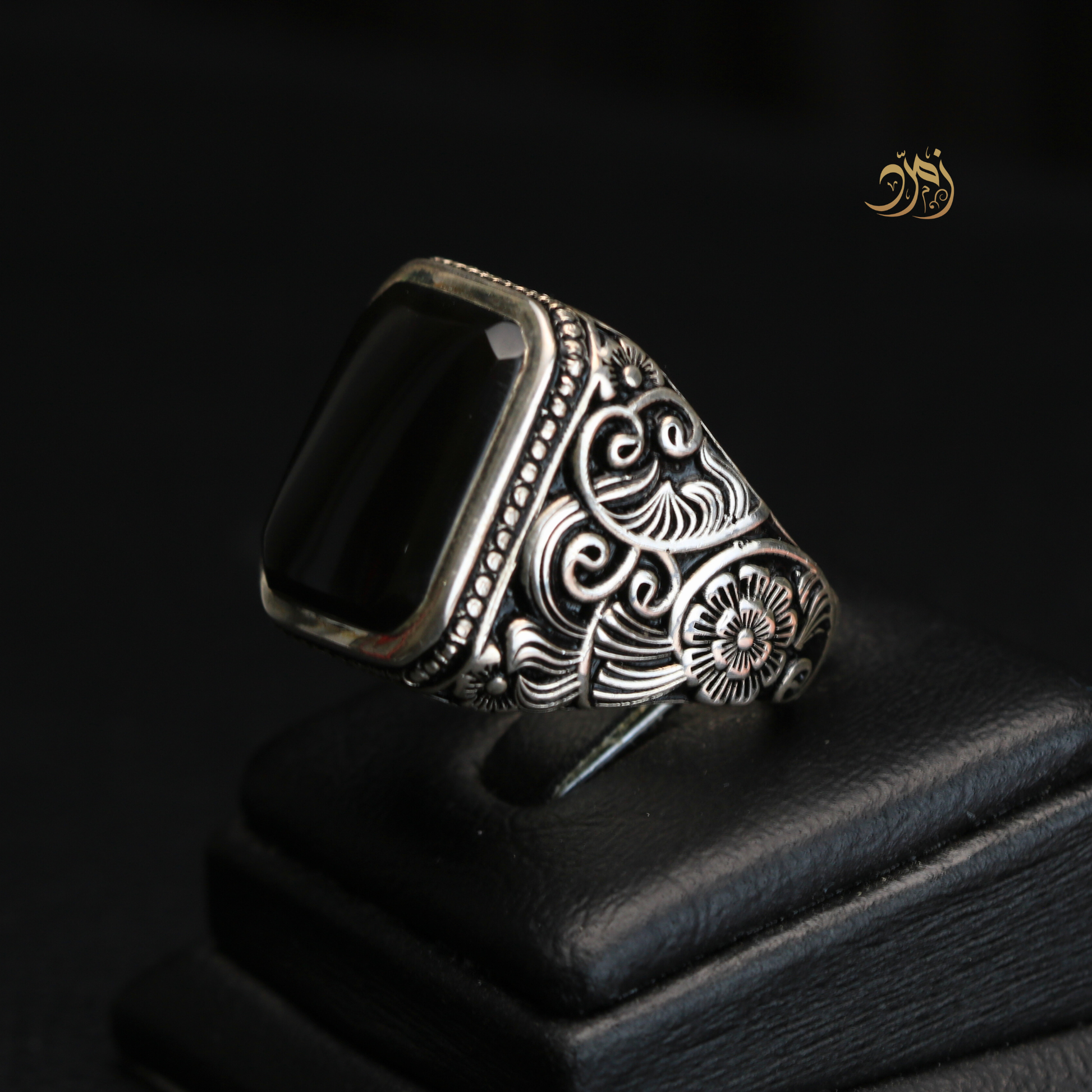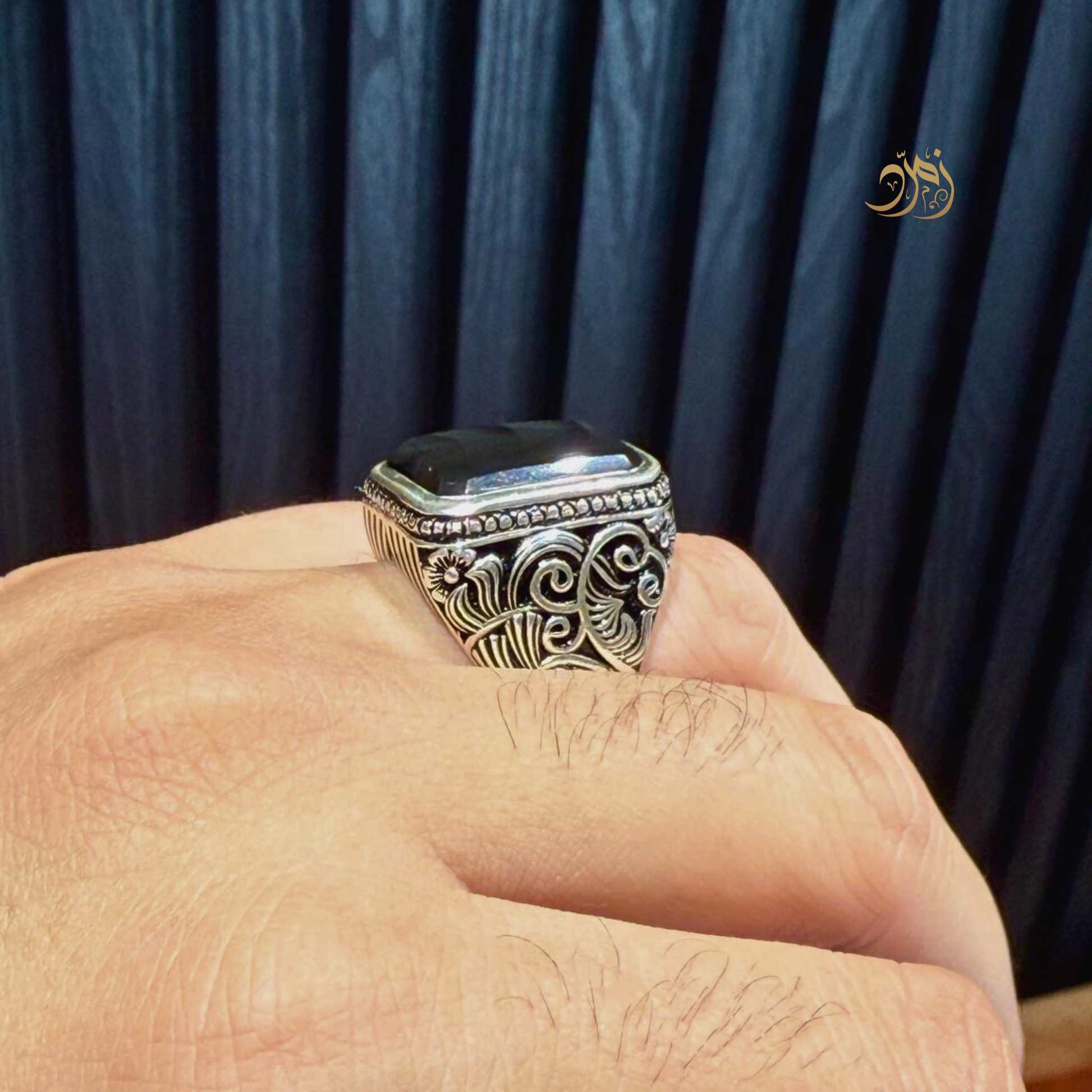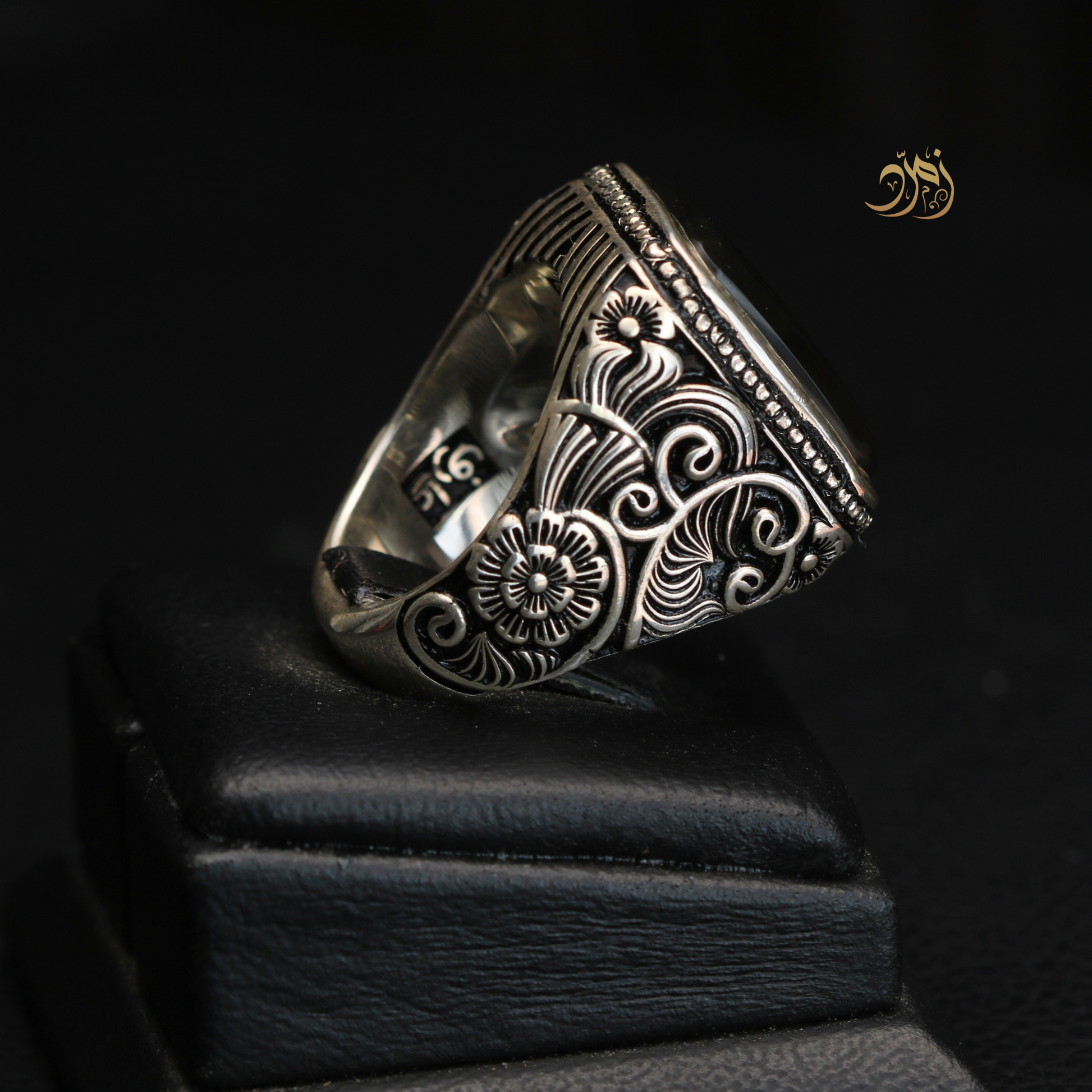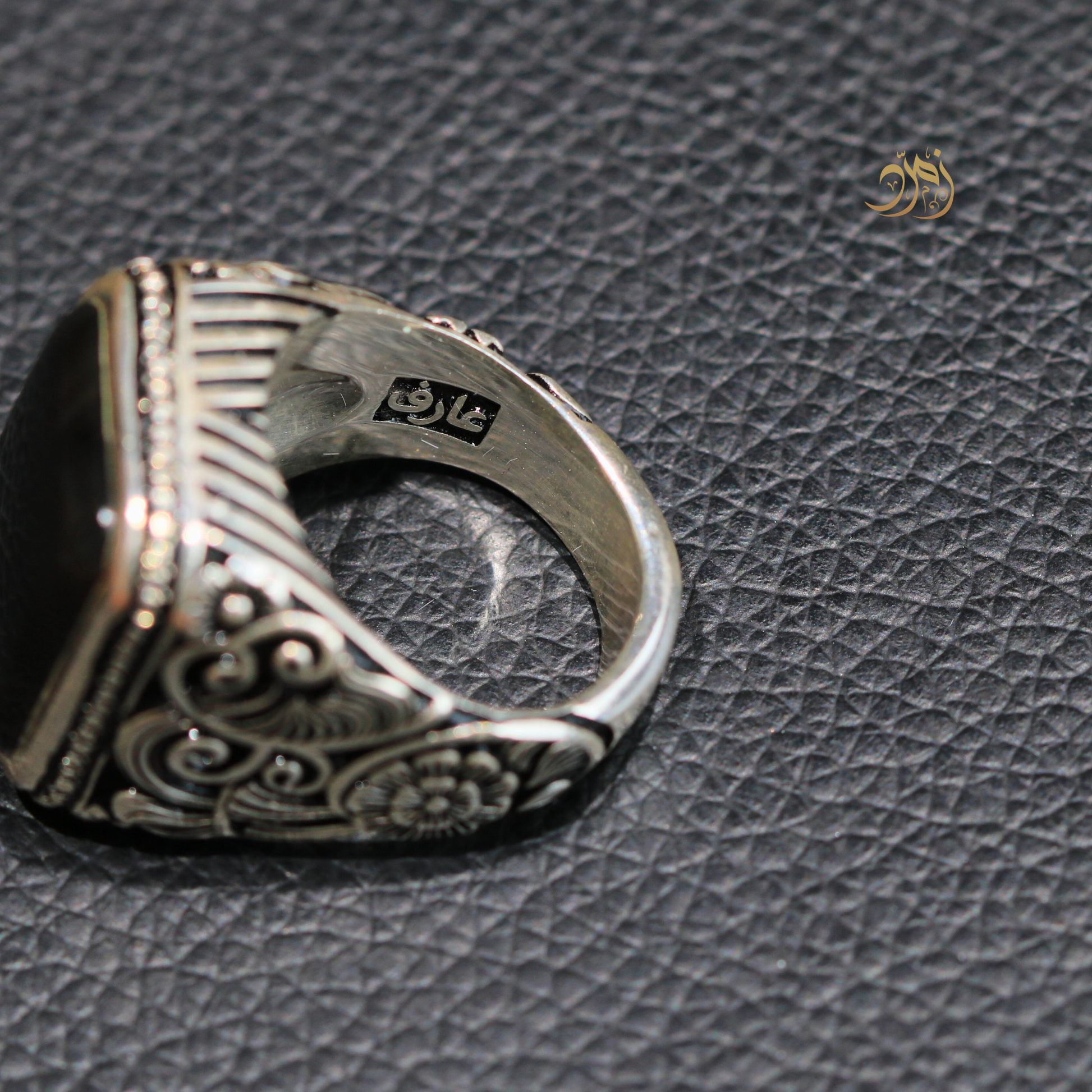 خاتم رجالي فاخر بحجر عقيق يماني أسود طبيعي، مصاغ يدويًا بإتقان من فضة عيار 990 بتوقيع ورشة "عارف" المعروفة بأعمالها الفريدة وتفاصيلها الدقيقة. تصميم أنيق يعكس الفخامة والهيبة في كل تفصيلة.