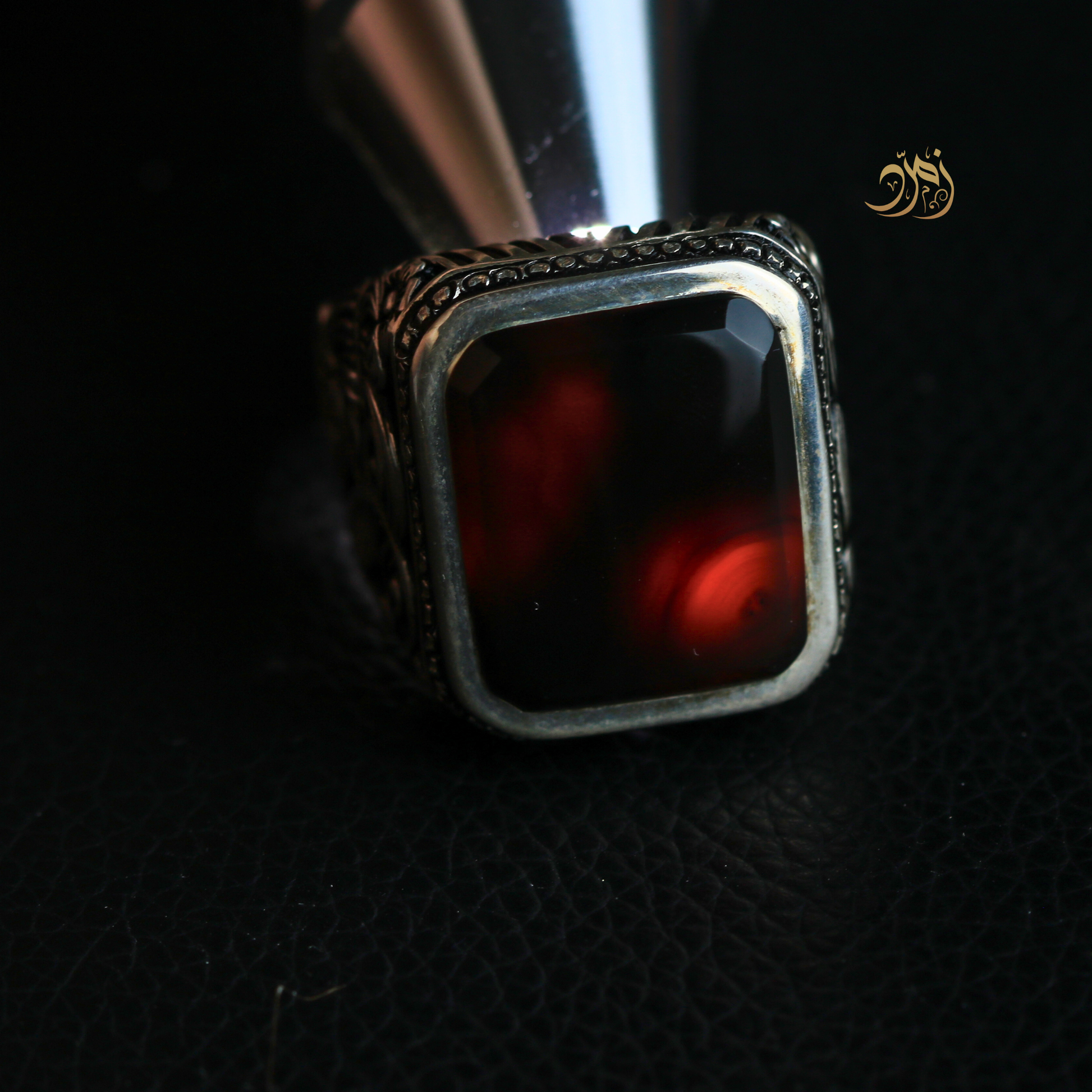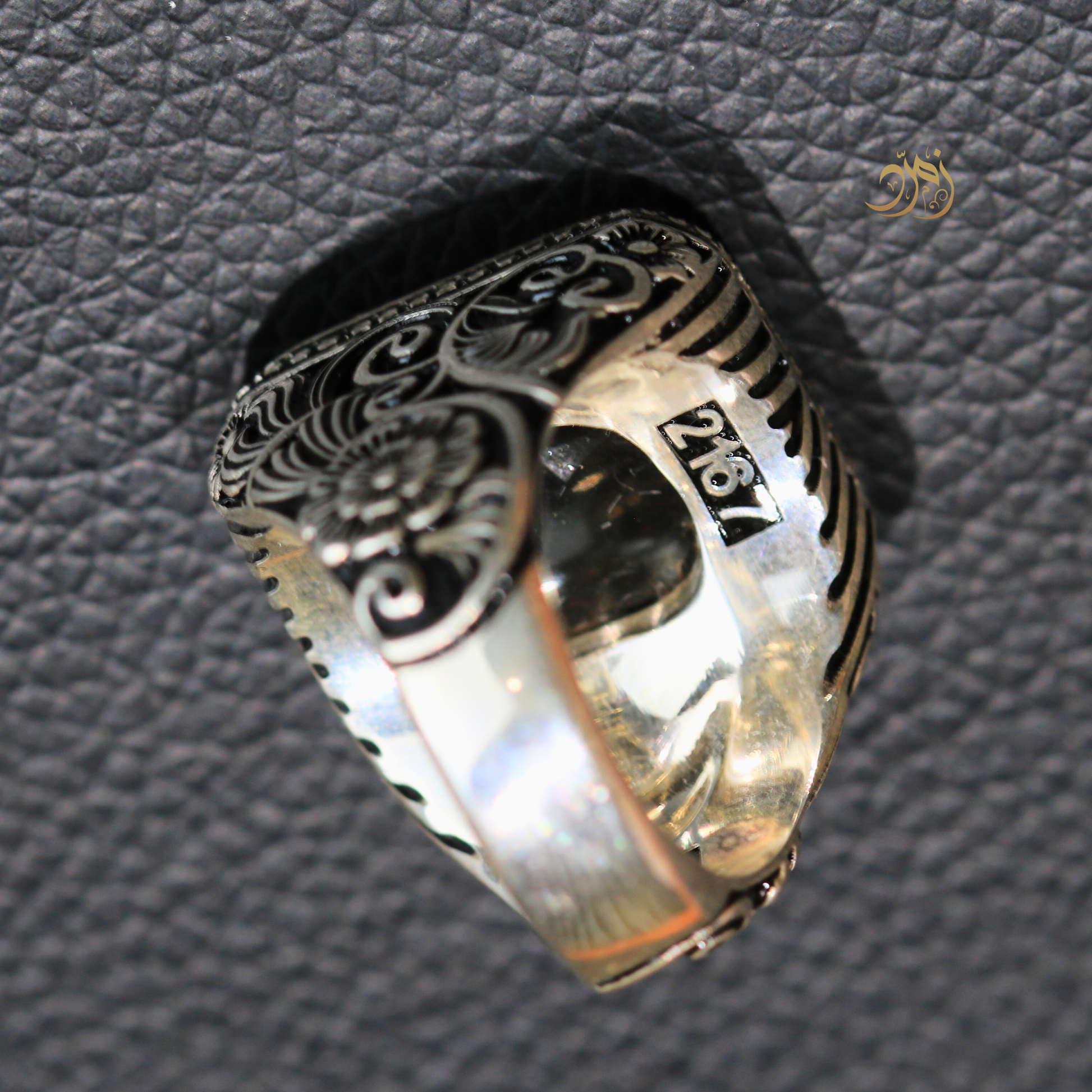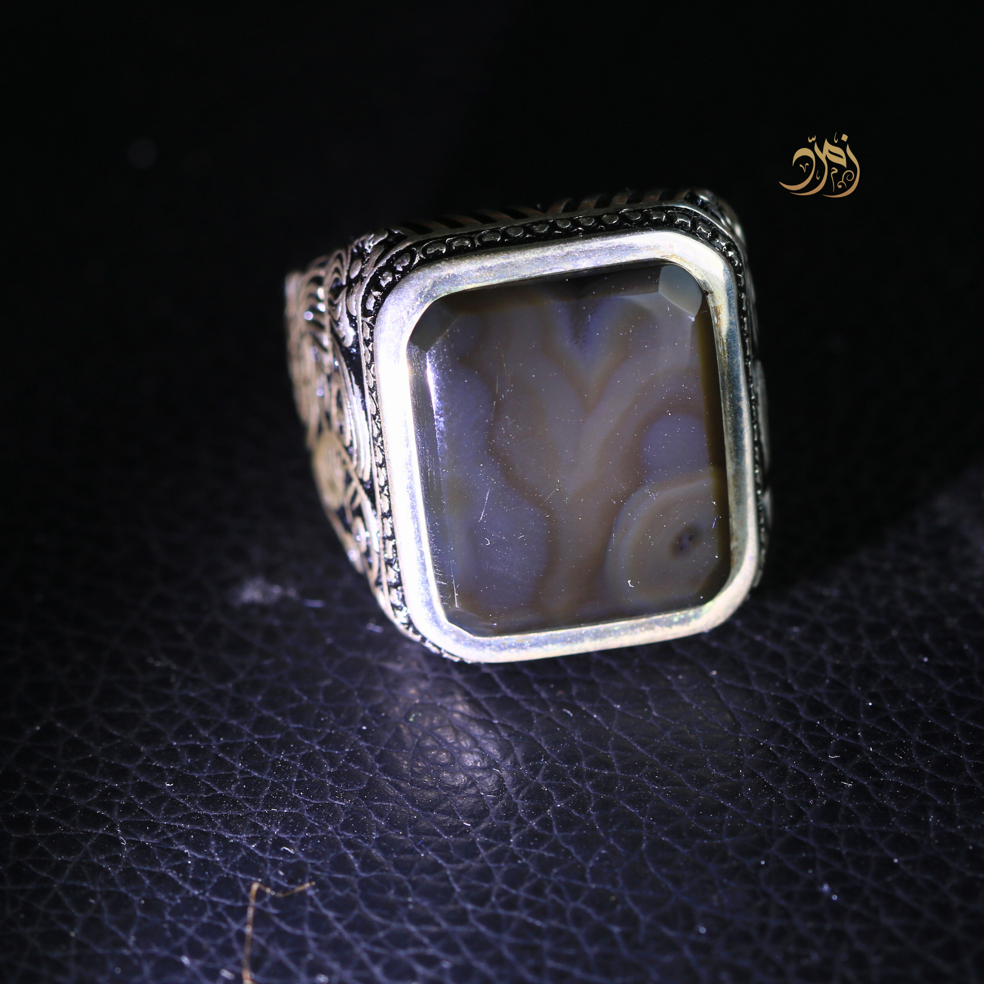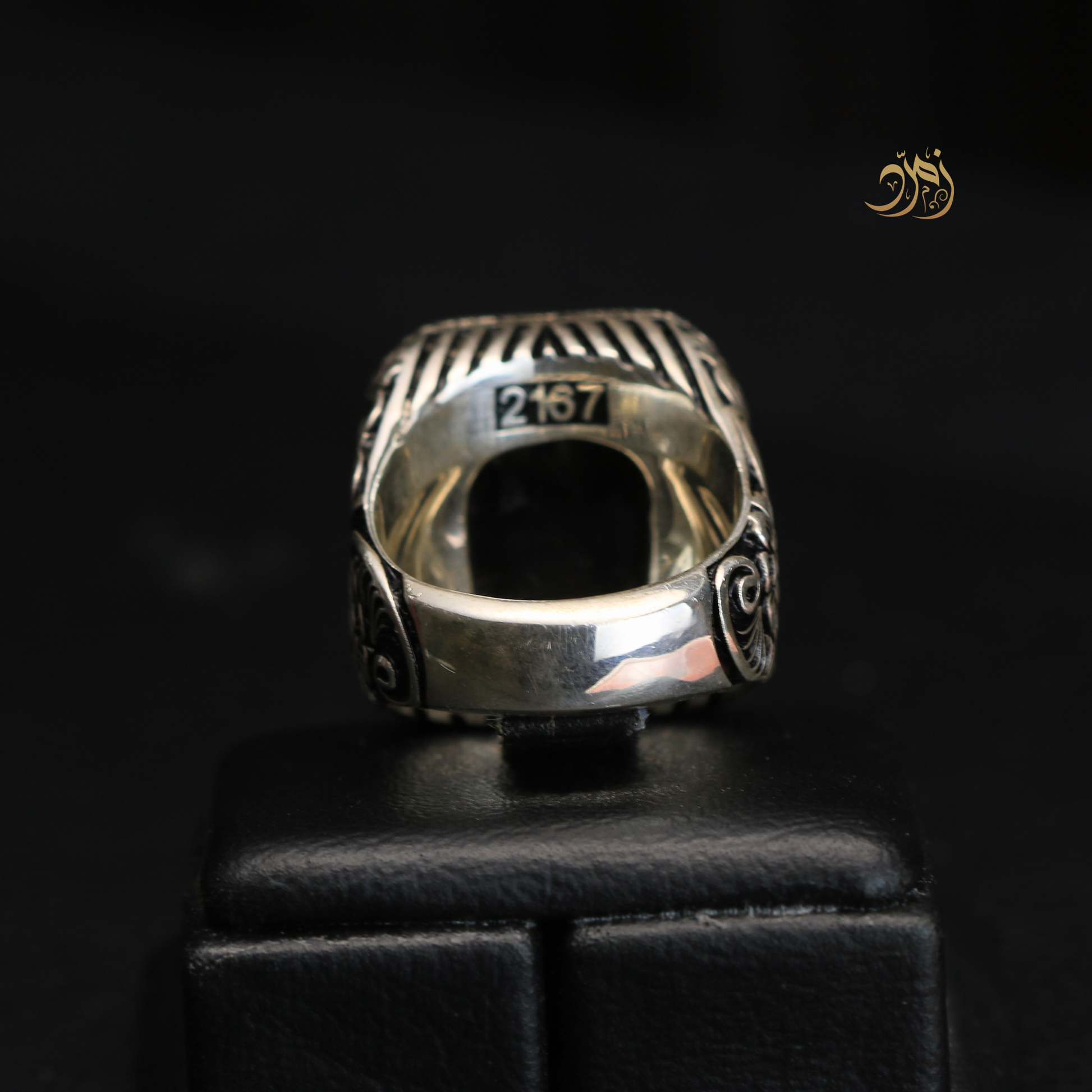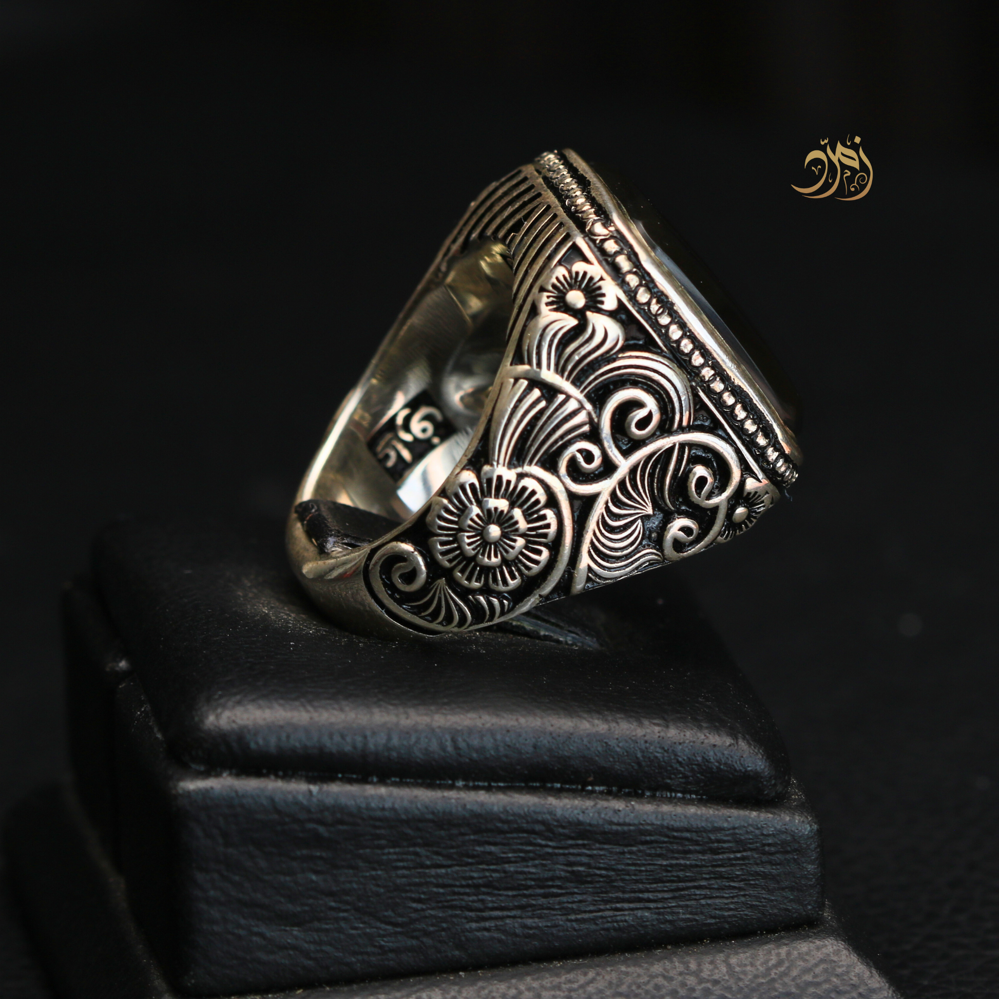 خاتم رجالي فاخر بحجر عقيق يماني أسود طبيعي، مصاغ يدويًا بإتقان من فضة عيار 990 بتوقيع ورشة "عارف" المعروفة بأعمالها الفريدة وتفاصيلها الدقيقة. تصميم أنيق يعكس الفخامة والهيبة في كل تفصيلة.