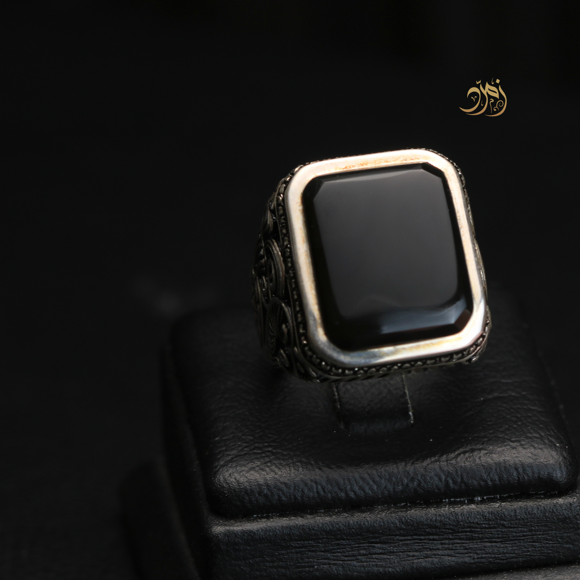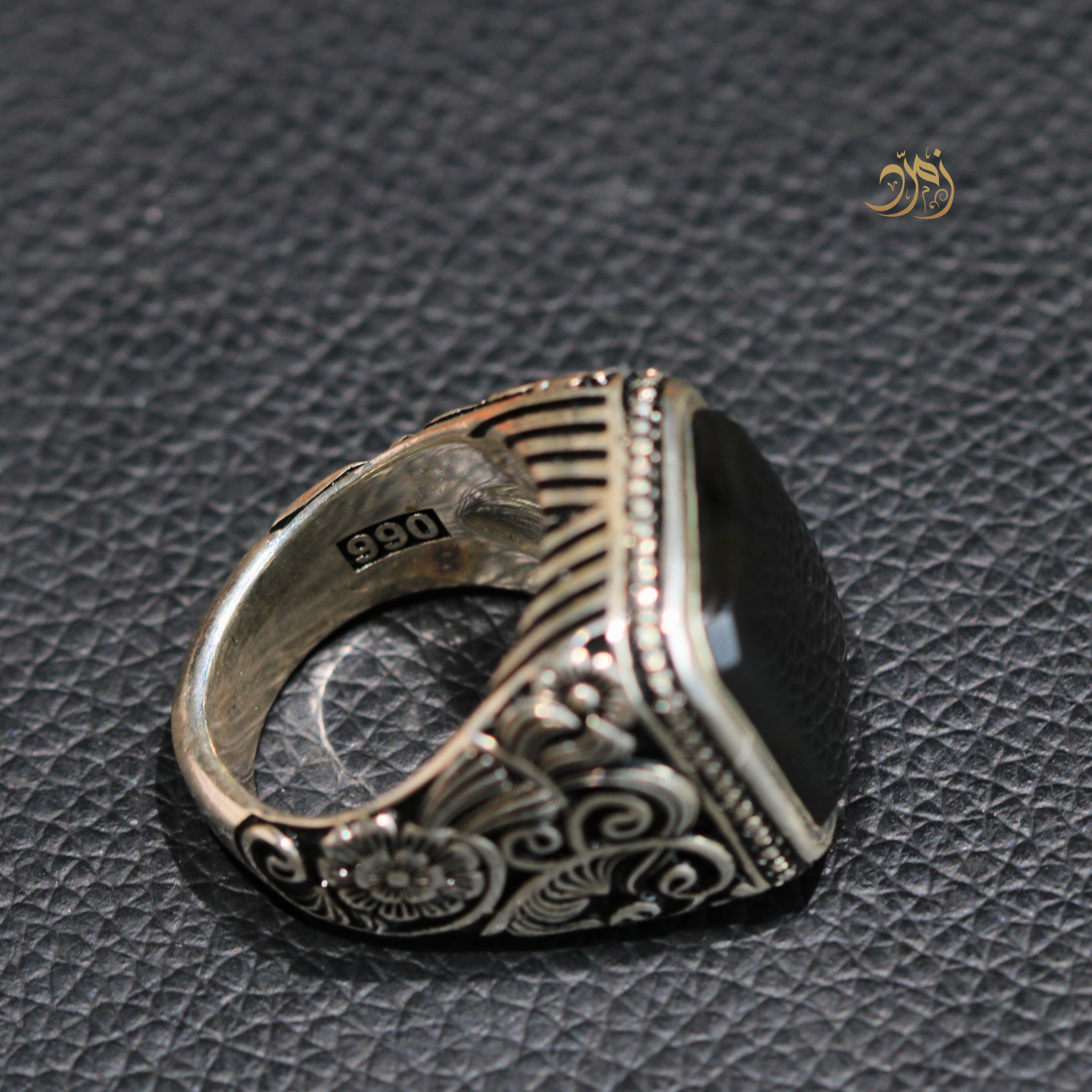 خاتم عقيق يماني أسود – فضة 990 – صياغة عارف