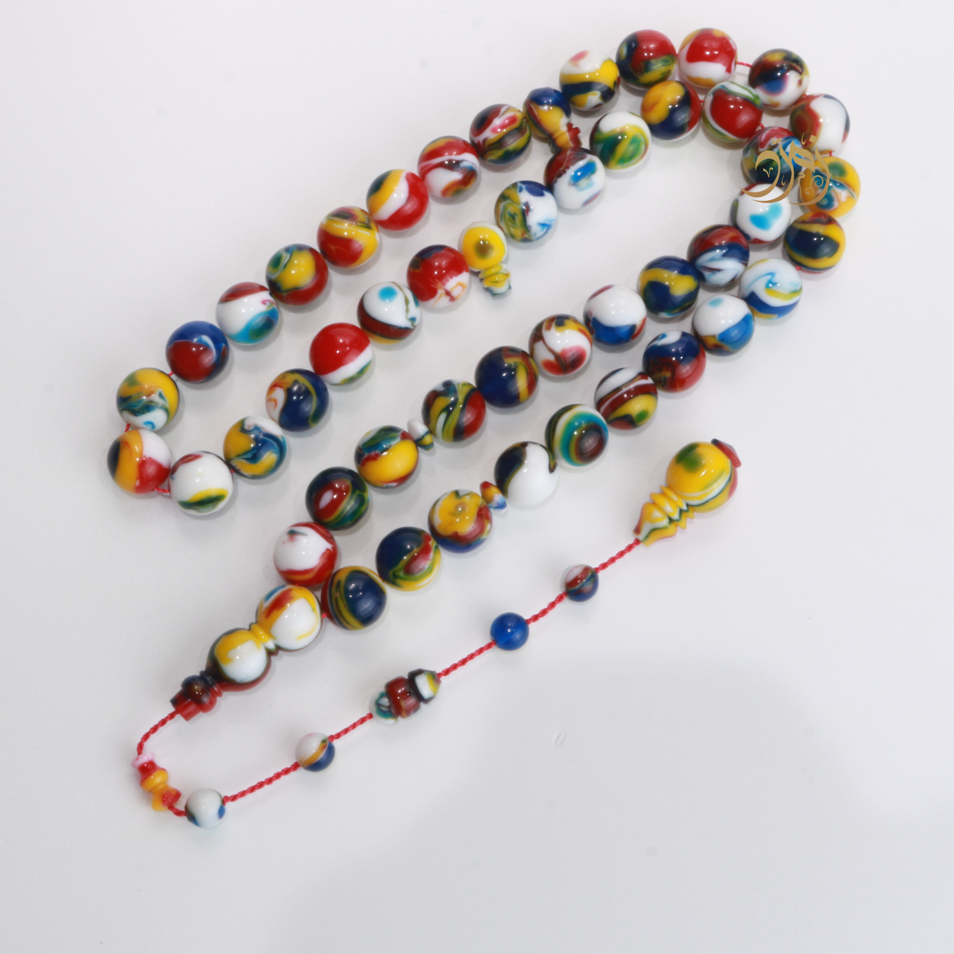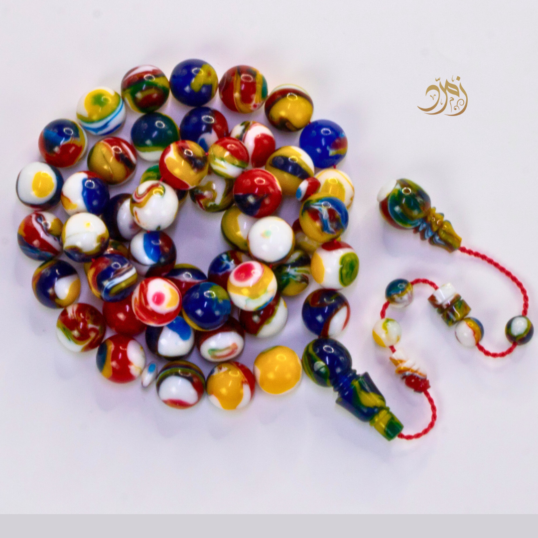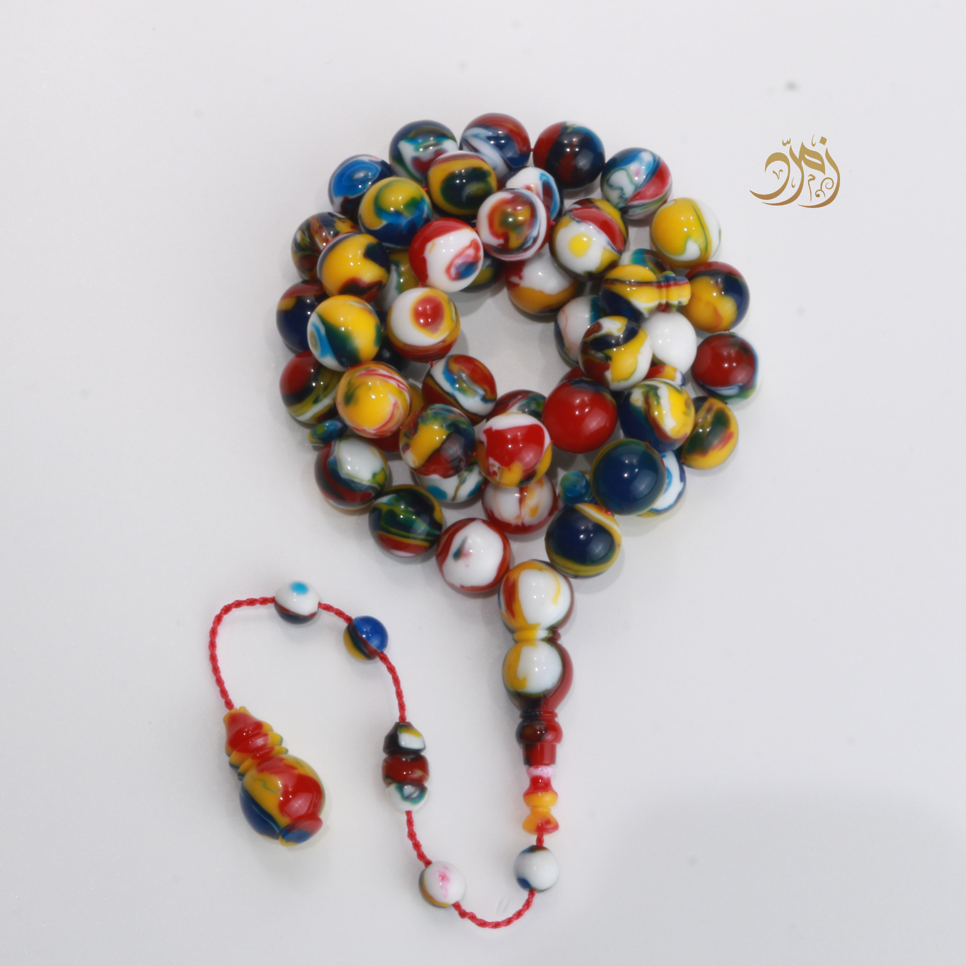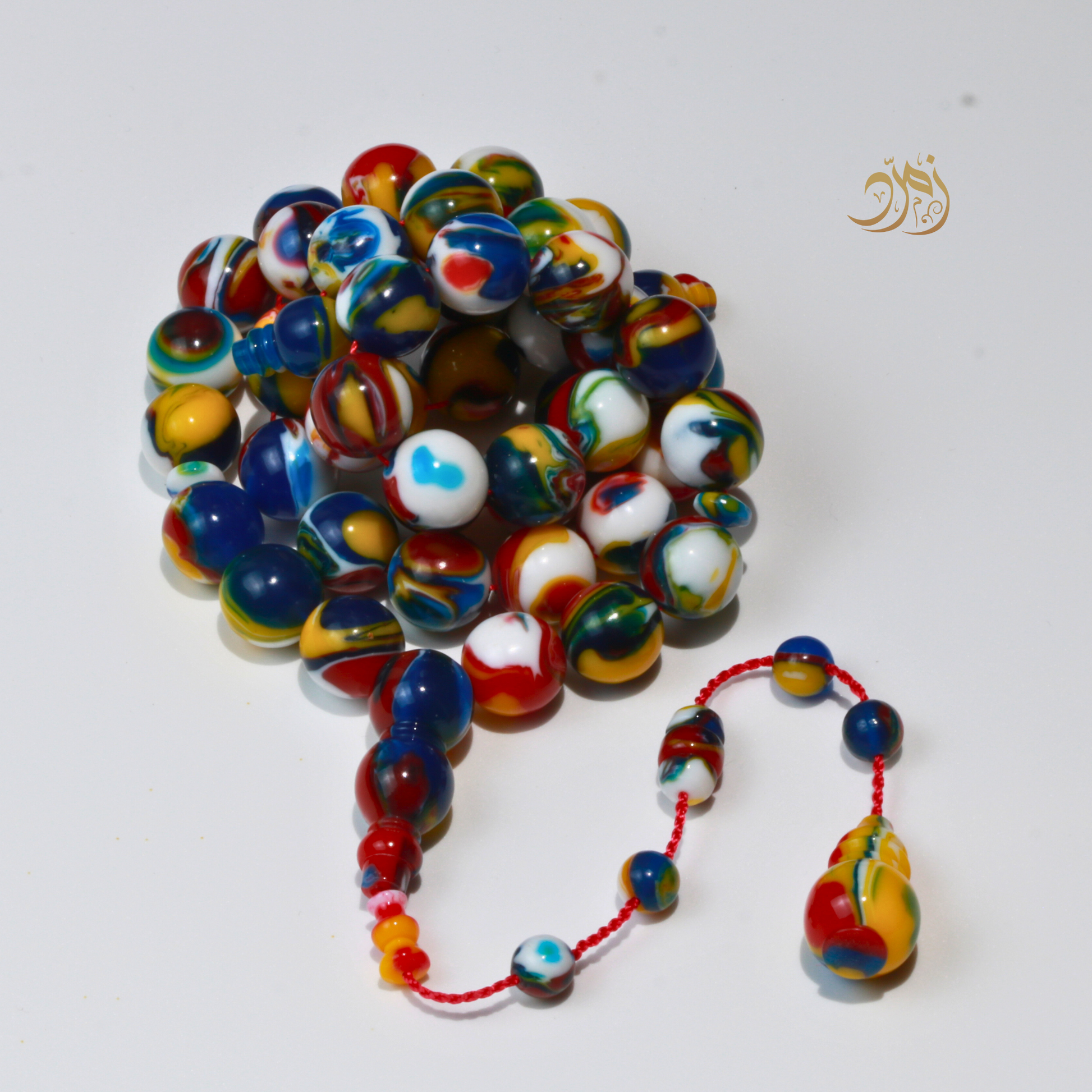 سبحة استثنائية بتدرجات ألوان غنية تجمع بين الأصفر، الأحمر، الأزرق، والأبيض بأسلوب انسيابي ملفت. تضفي كل خرزة طابعًا خاصًا بفضل الدمج الفريد بين الألوان، وتتميز بملمس ناعم يليق بذوقك الرفيع.