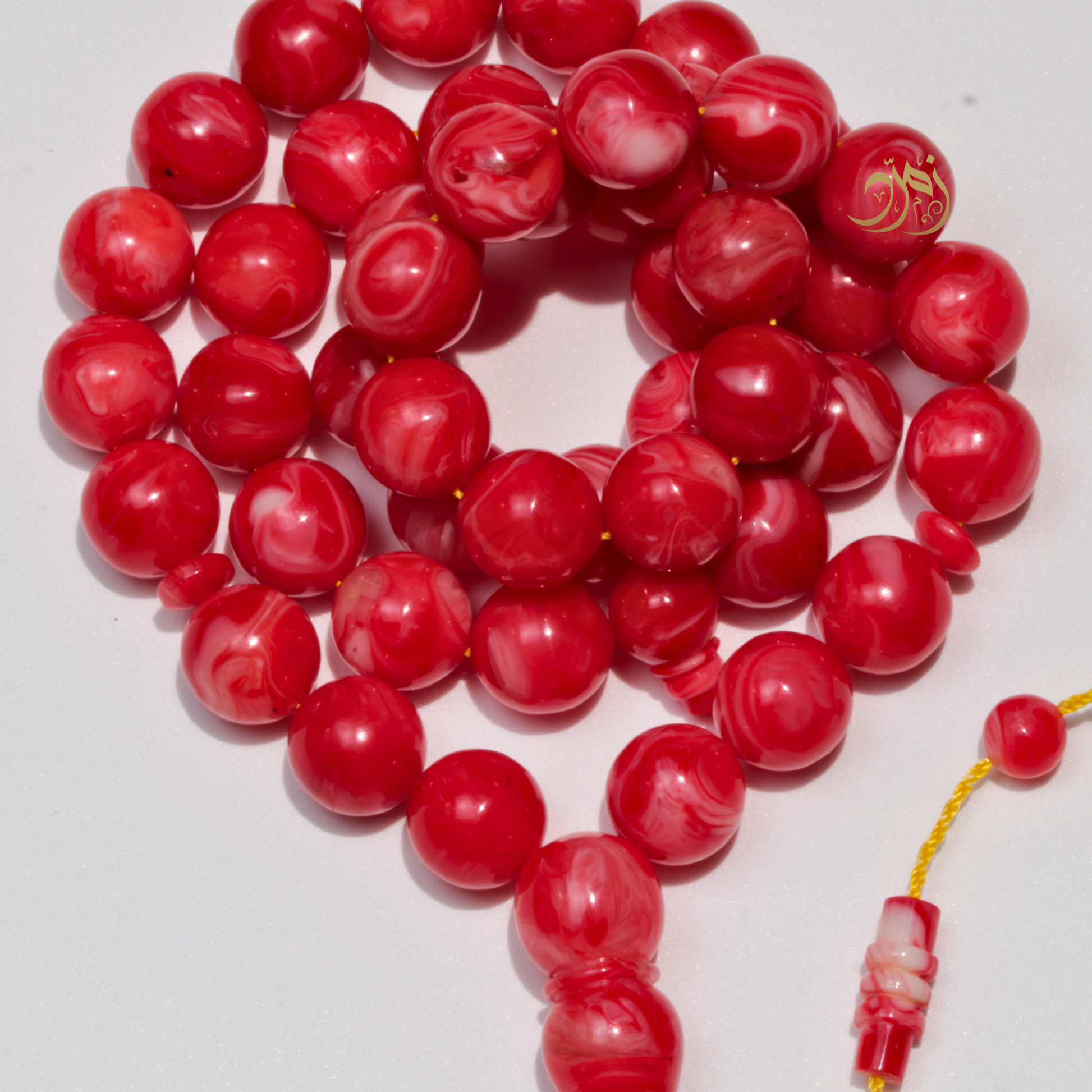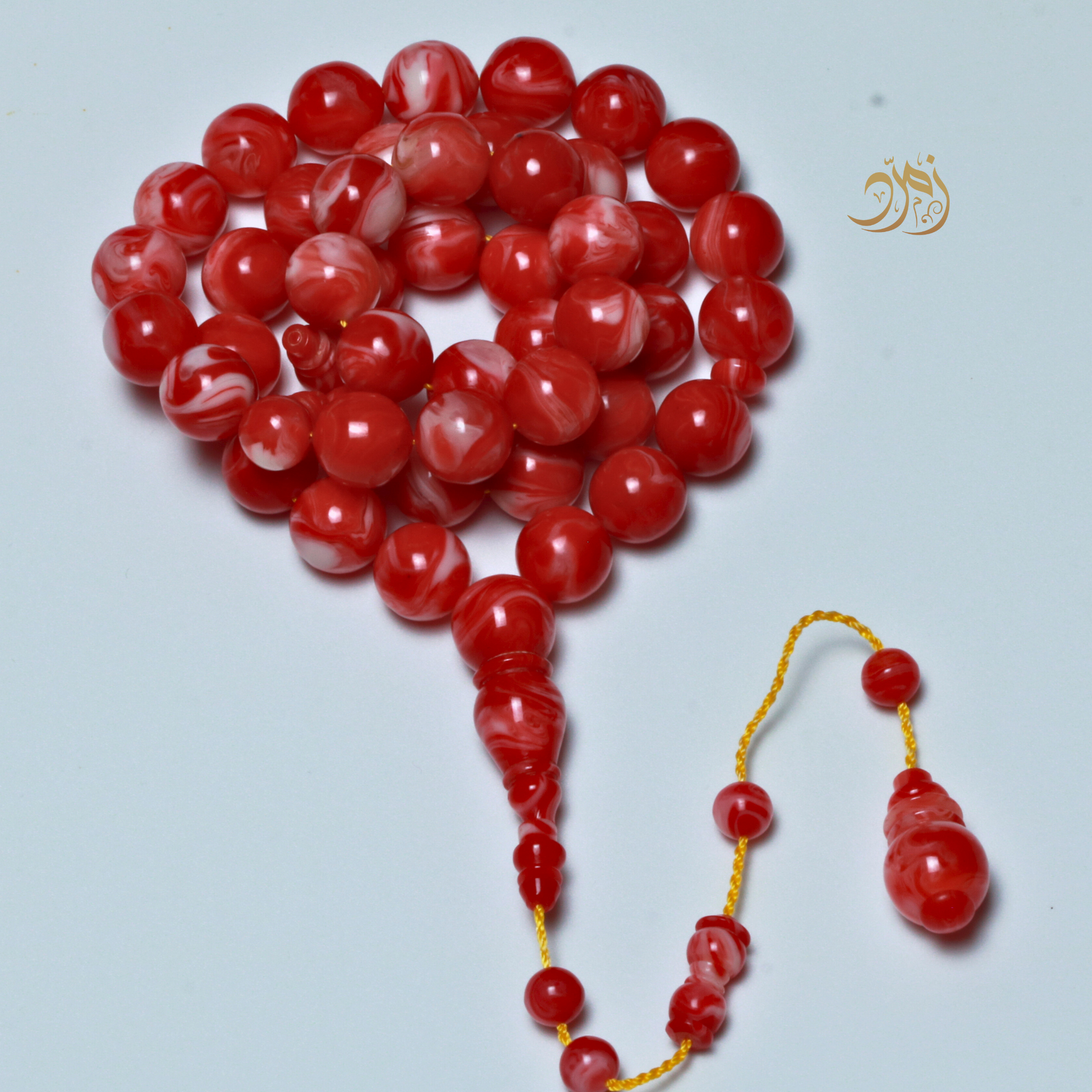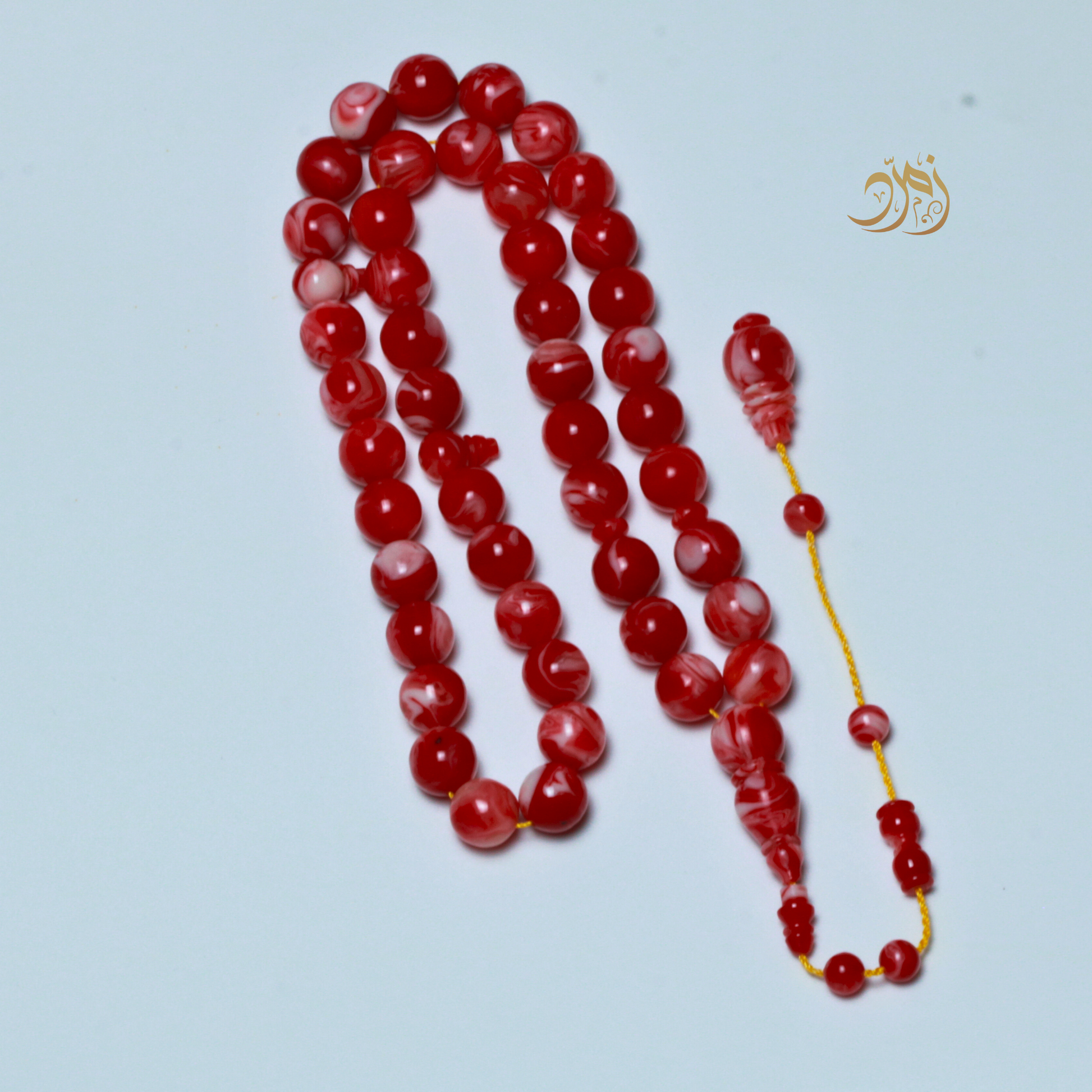 تم خراطتها يدويًا بدقة من خامة بكلايت باسكن الأصلية ذات اللون الأحمر الغني مع تموجات بيضاء متجانسة، لتمنحك سبحة ذات حضور فريد وأناقة نادرة.