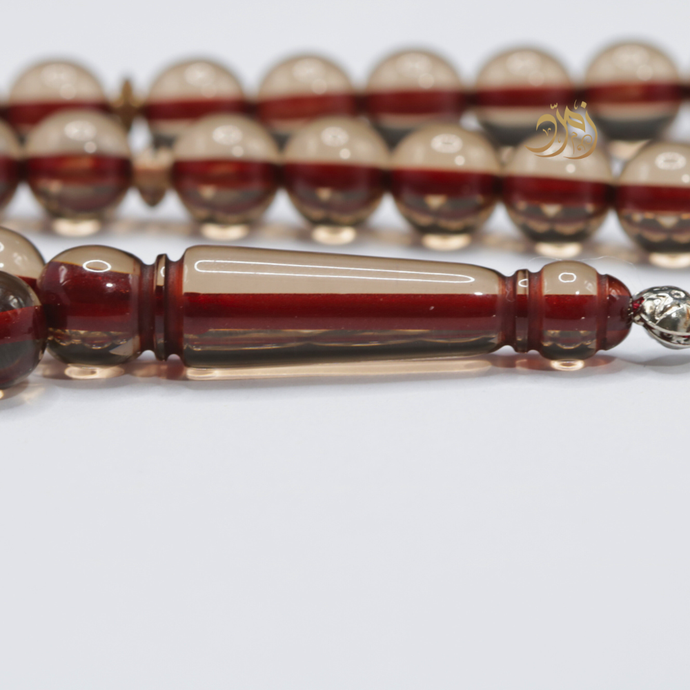 سبحة أنيقة مصنوعة من بكلايت عالي الجودة بتدرجات لون بني دخاني مع شريط أحمر داخلي يعطيها طابعاً فريداً وراقياً.