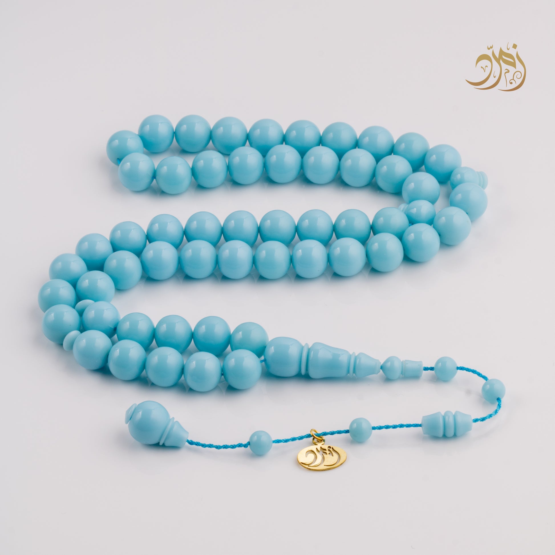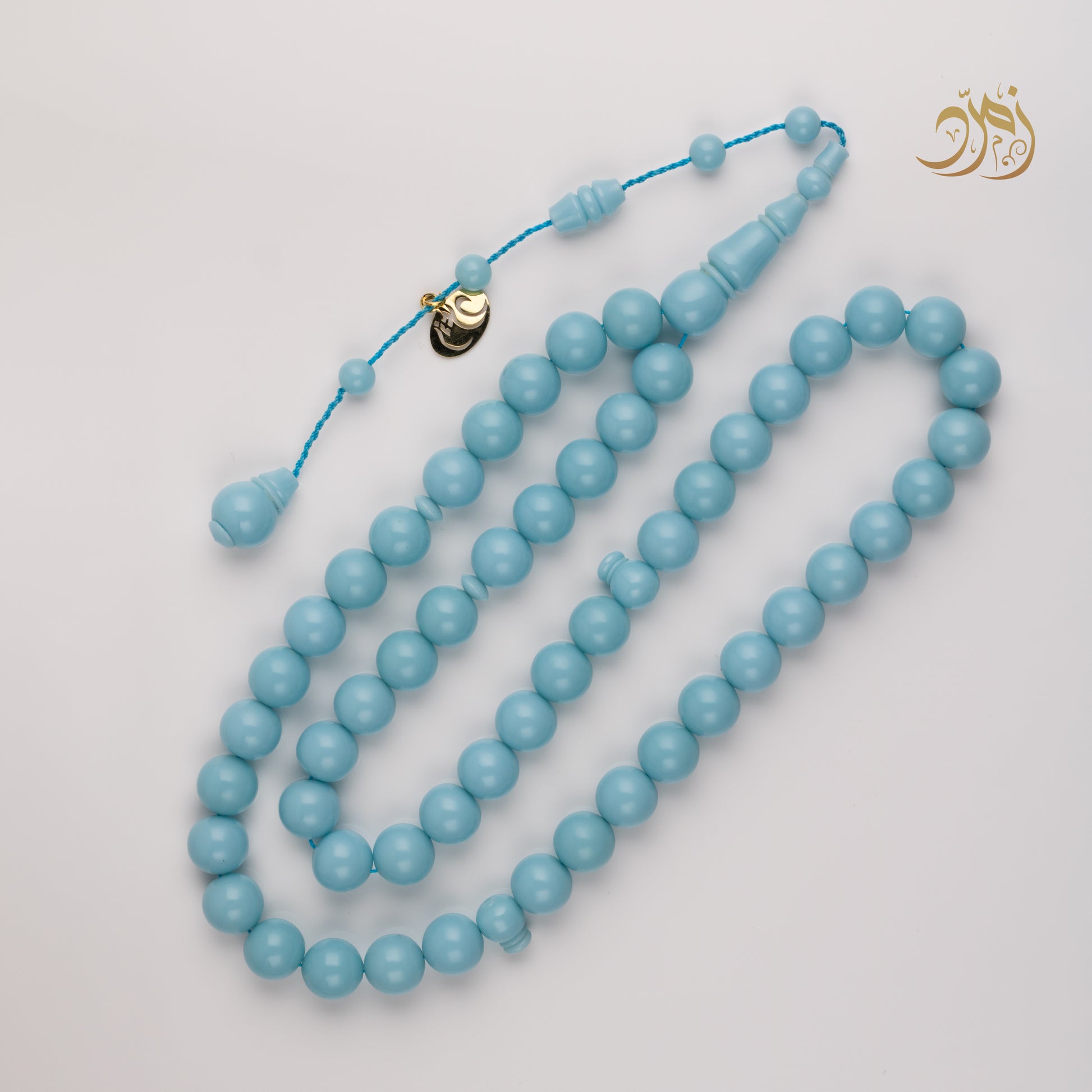 سبحة فاخرة مصنوعة من خامة البولنج الصب الجديد عالية الكثافة، بلون تركوازي لامع متجانس يلفت النظر ويمنح شعورًا بالهدوء والتميّز.