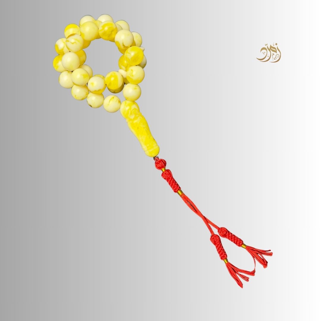 سبحة فاخرة مصنوعة من تراب الكهرب الفواح،(طبيعي + صناعي ) بتدرجات لونية دافئة بين الأصفر الفاتح والعاجي، تمنحها مظهرًا ناعمًا وأنيقًا.