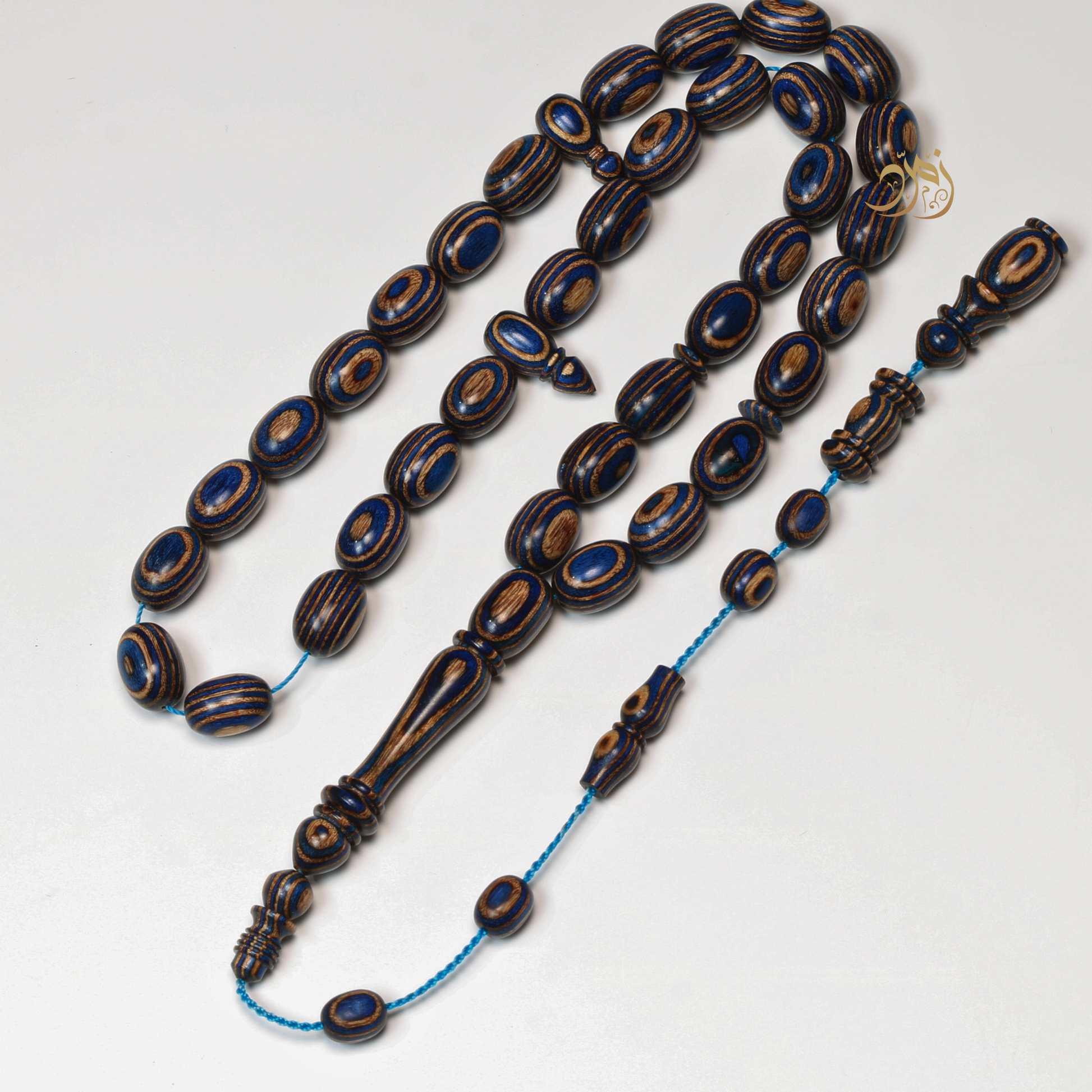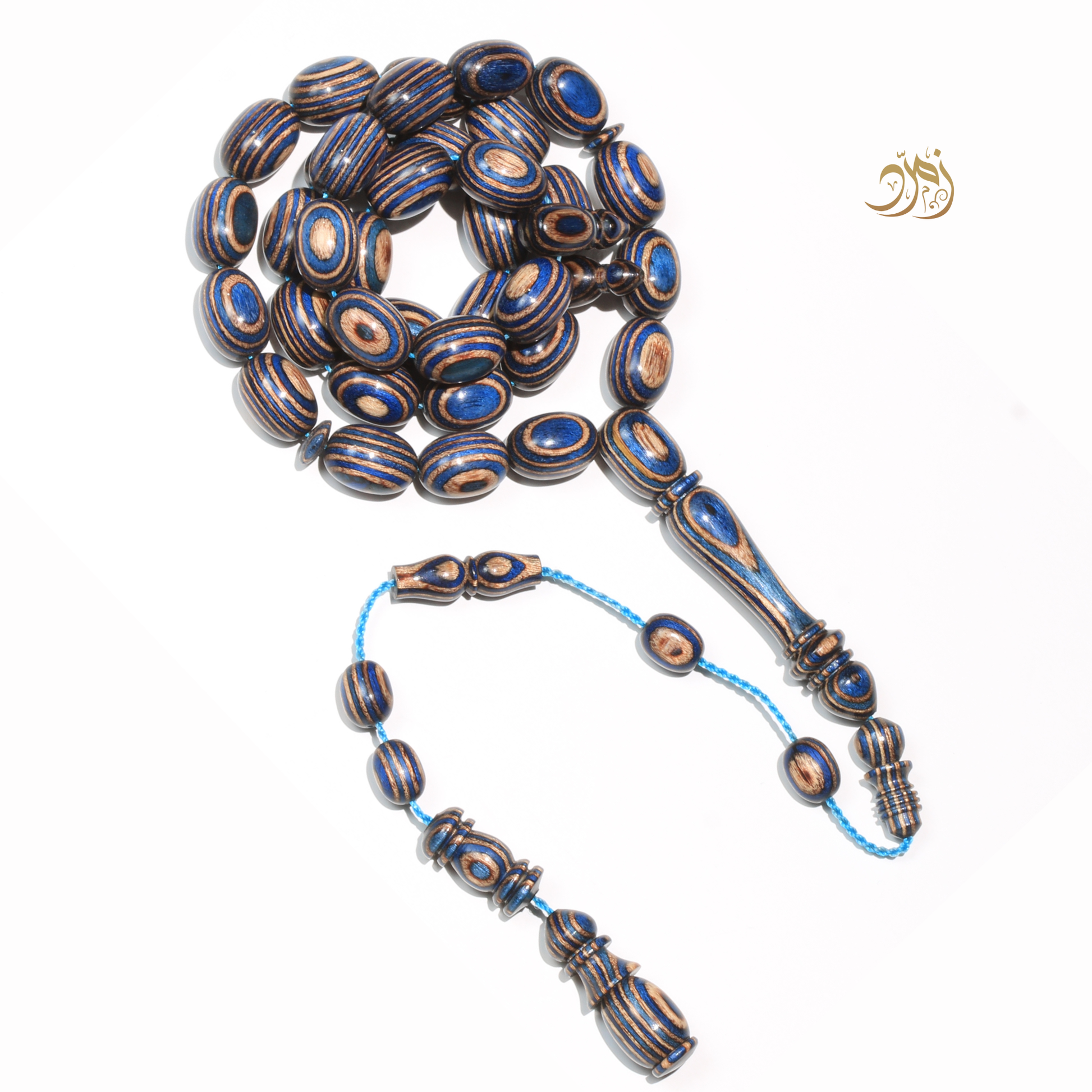تحفة فنية تجمع بين الدقة اليدوية والجمال الطبيعي للخشب. صُنعت هذه السبحة من خشب الكافور المضغوط بتمازج رائع بين الأزرق النيلي والخطوط الخشبية الطبيعية التي تمنح كل خرزة مظهراً فريداً لا يتكرر. تميّزها خراطة يدوية دقيقة وتشطيب لامع يعكس الفخامة والأناقة.