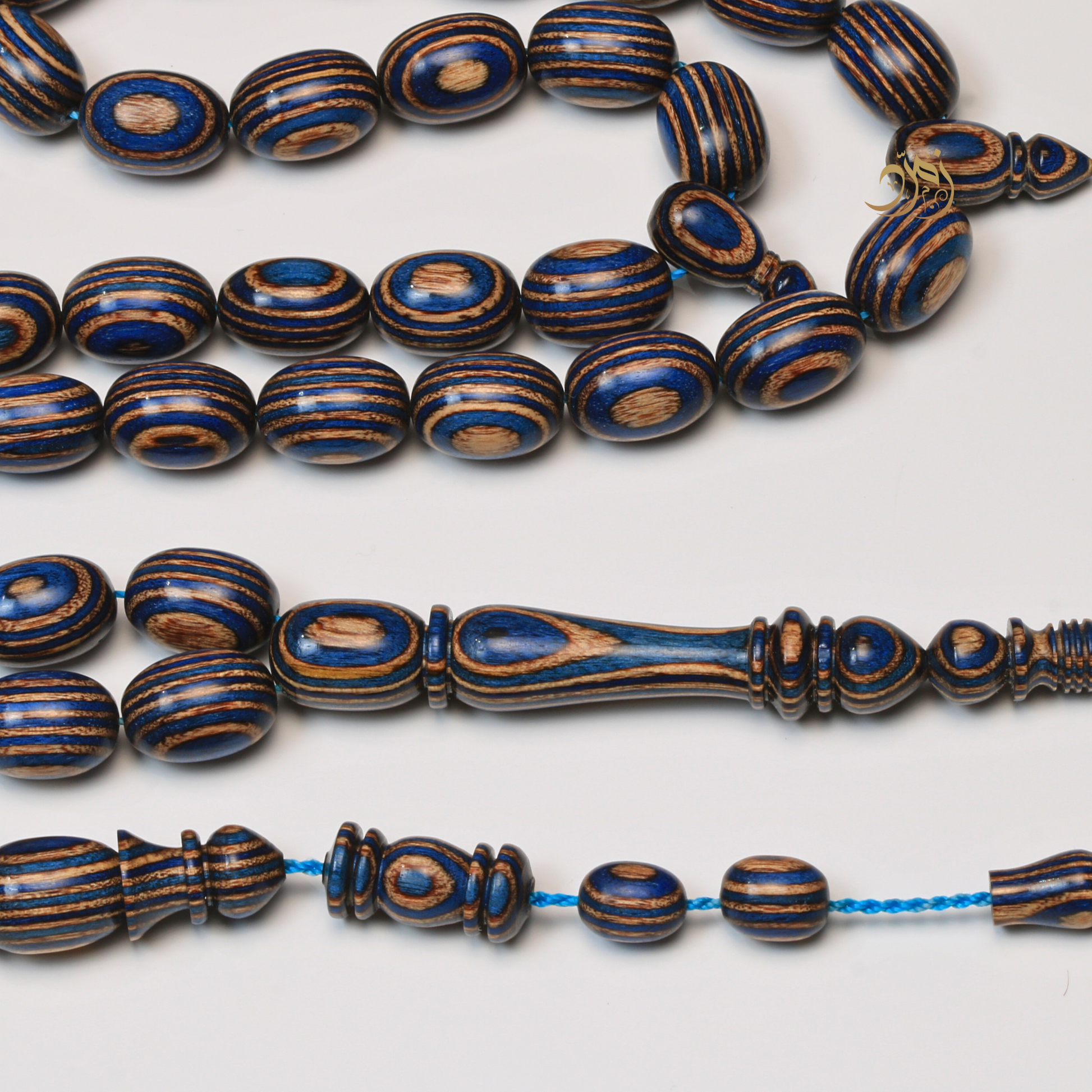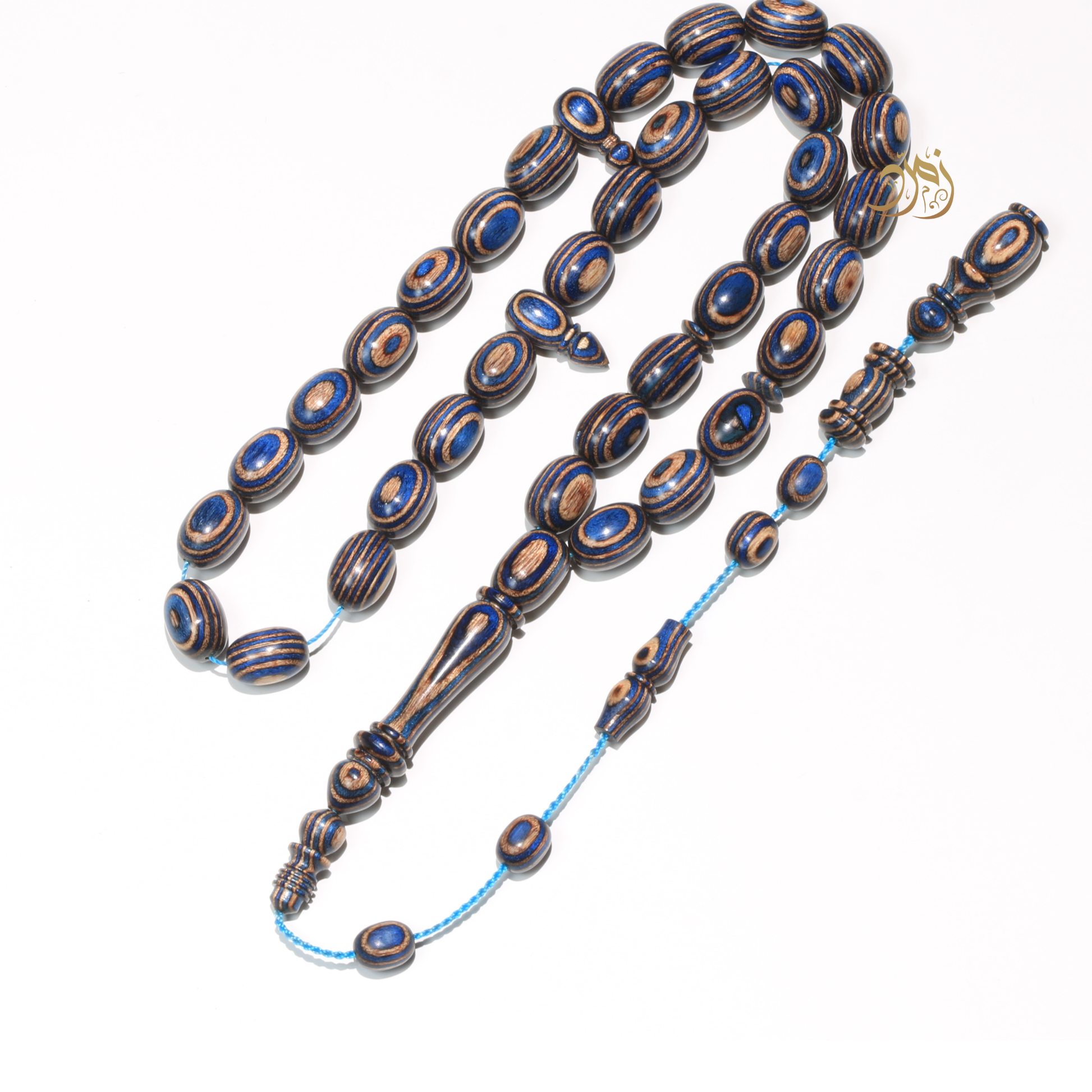 سبحة خشب كافور مضغوط أزرق عيون– 35 خرزة بيض حمام (10×14 مم) – خراطة يدوية