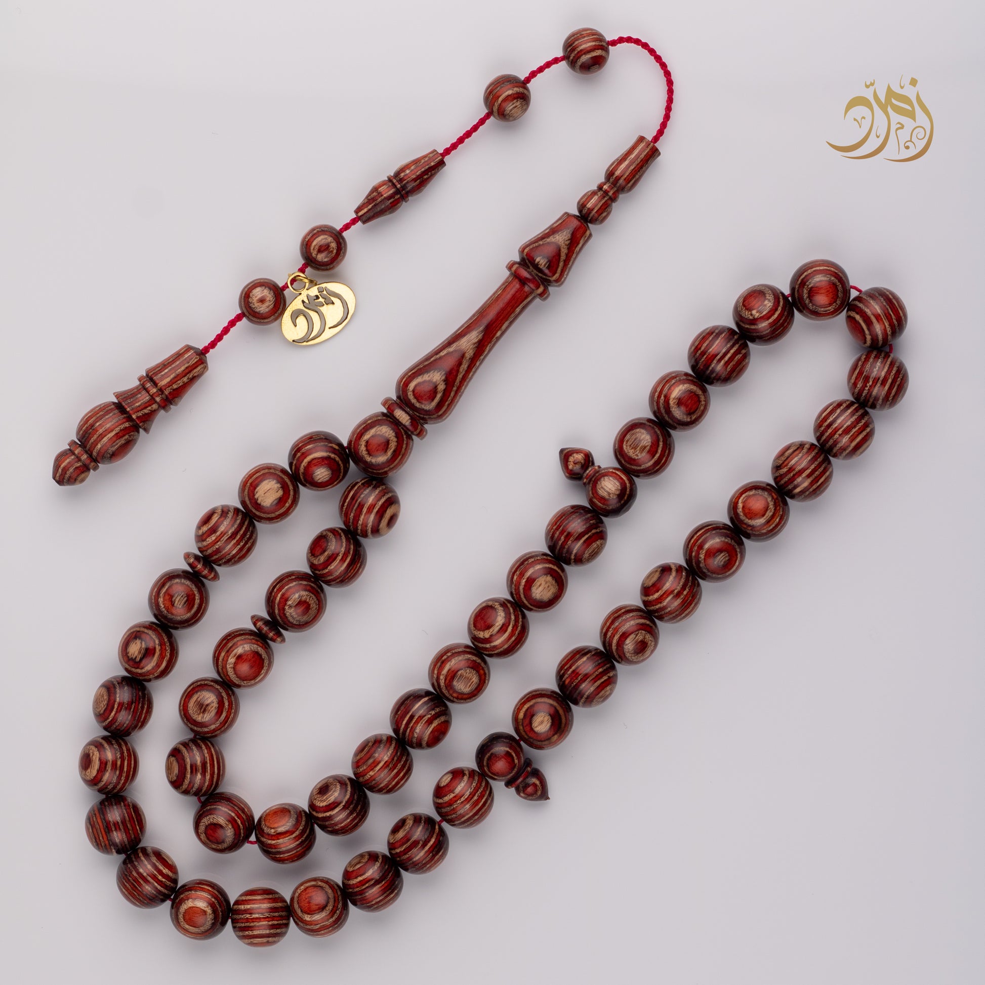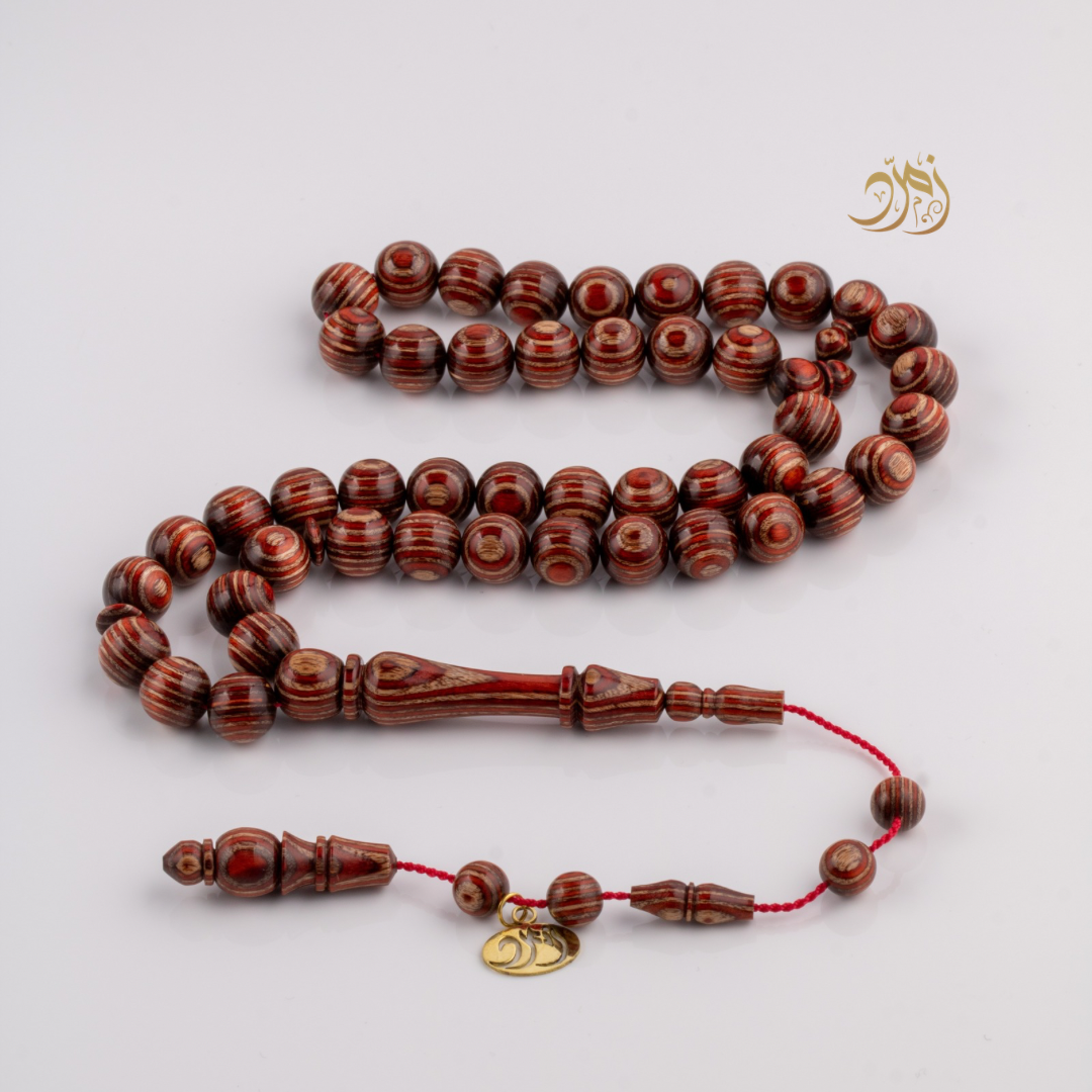 قطعة فاخرة بملمس دافئ ورائحة خشبية خفيفة، صُنعت من خشب الكافور المضغوط بدرجات خشبي أحمر مخطط بالبيج تمنح كل خرزة روحًا خاصة. صُنعت بخراطة يدوية دقيقة لتقدم توازناً رائعاً بين المظهر الكلاسيكي والاستخدام اليومي، وتأتي بتشطيب لامع أنيق يبرز تموّجات الخشب الطبيعية.