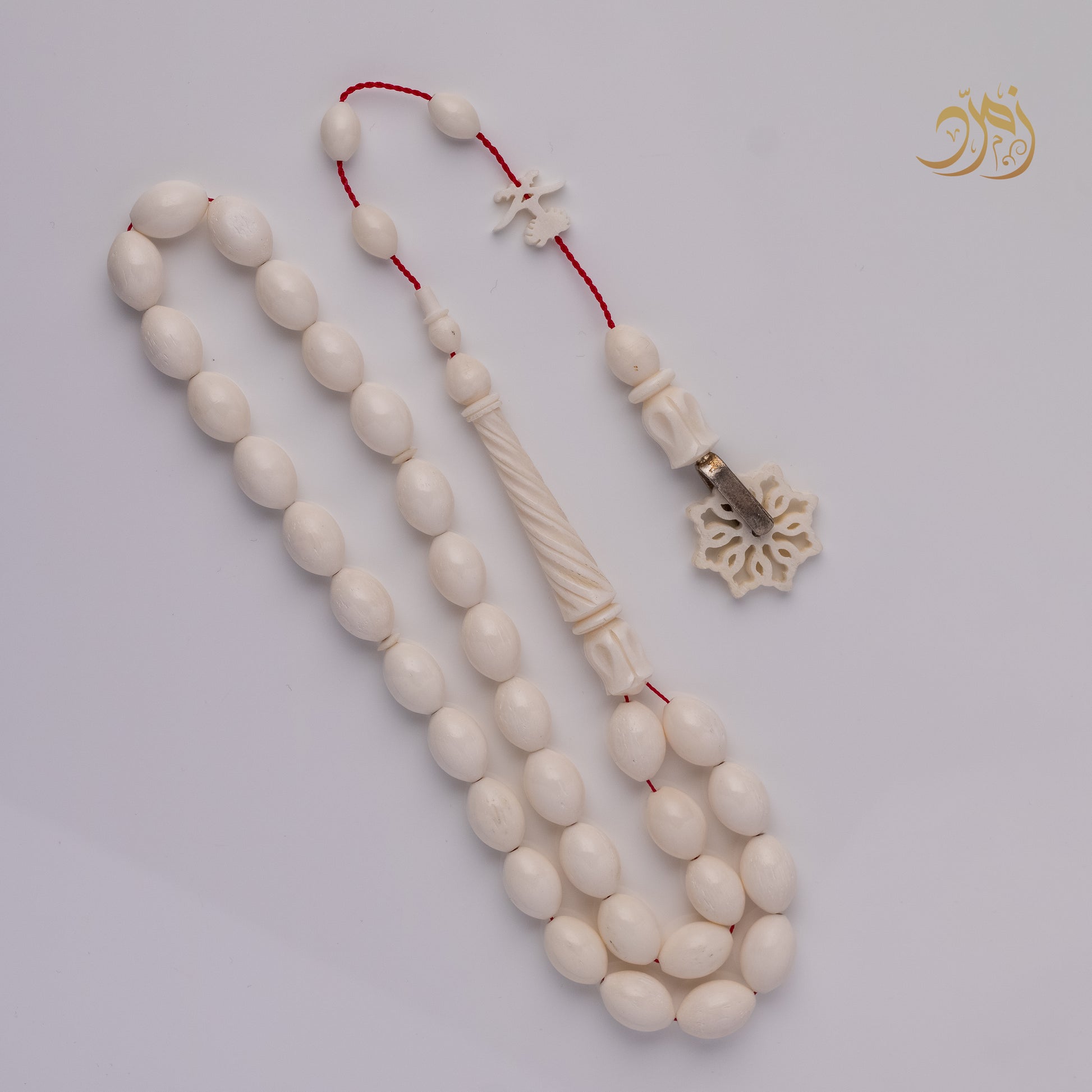 سبحة يدوية فاخرة مصنوعة من عظم الجمل الطبيعي، بتصميم زيتوني كلاسيكي ولمسة ناعمة وأنيقة.