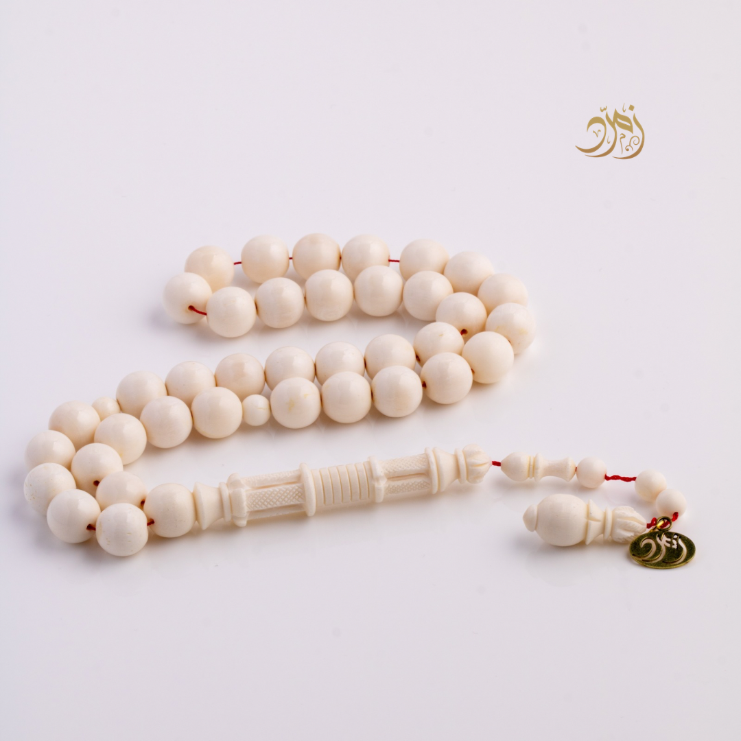 سبحة فاخرة مصنوعة يدويًا من عظم الجمل الطبيعي، تتميز بلون عاجي أنيق وملمس ناعم يعكس الأصالة والفخامة. ما يميز هذه السبحة هو نقش الشاهد على شكل مئذنة بشكل دقيق ومميز، مما يضفي عليها طابعًا روحانيًا وجماليًا فريدًا.