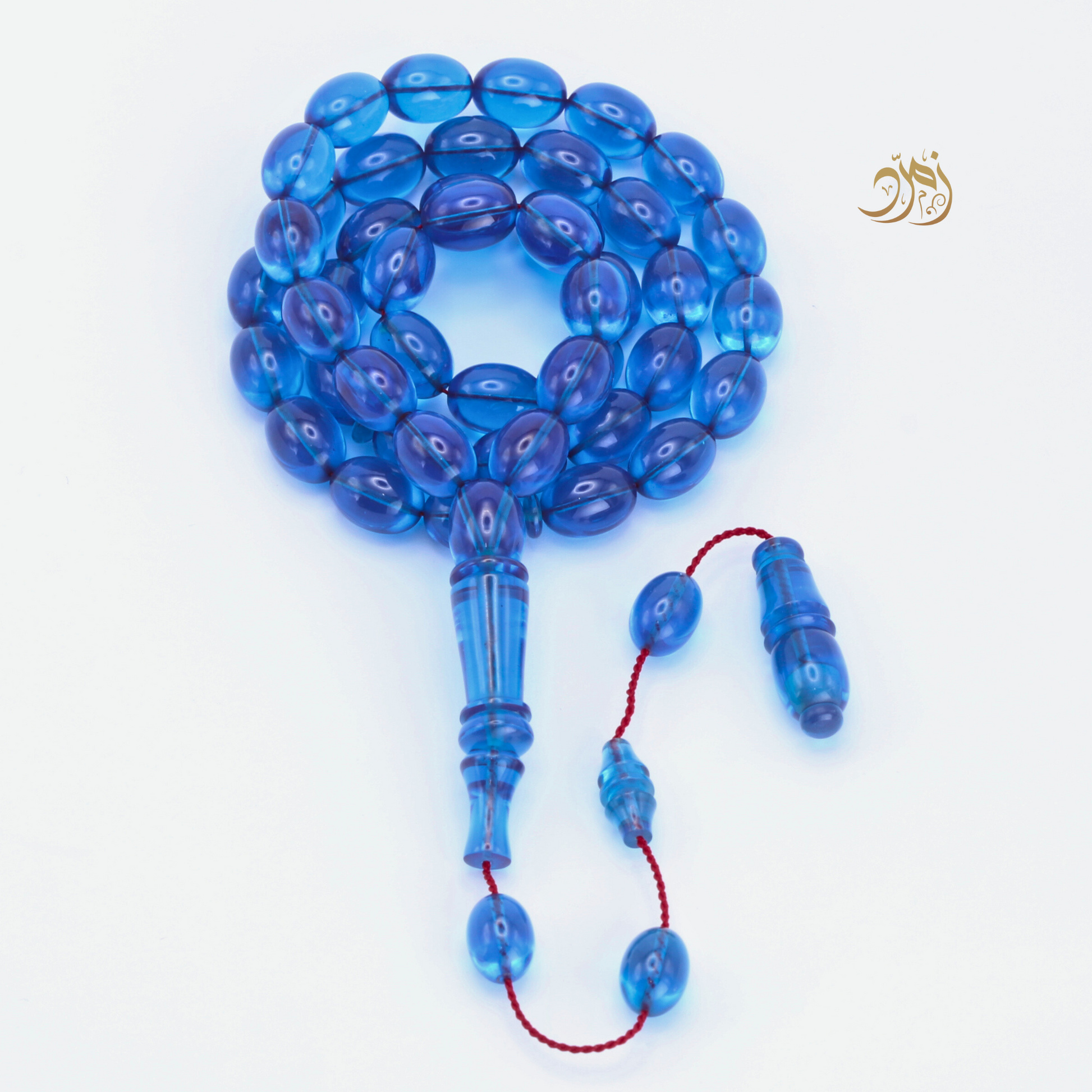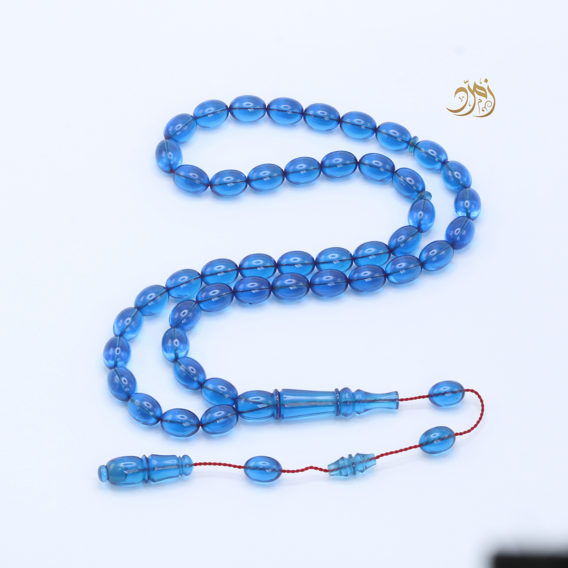 سبحة مميزة من خامة "الفاتوران المصنّع"، بتصنيع وخراطة احترافية من ورشة لبابيدي المعروفة بجودتها العالية. تأتي هذه السبحة بلون أزرق شفاف يخطف الأنظار، مع 45 خرزة بيضاوية مصقولة بعناية لتمنح راحة في اليد وصوتًا رنّانًا عند التسبيح. وزنها الثقيل وتصميمها المتقن يجعلانها قطعة فاخرة تليق بالجامعين ومحبي السبح المميزة. الخيط الأحمر يعكس فخامة اللون ويضيف توازنًا بصريًا رائعًا.