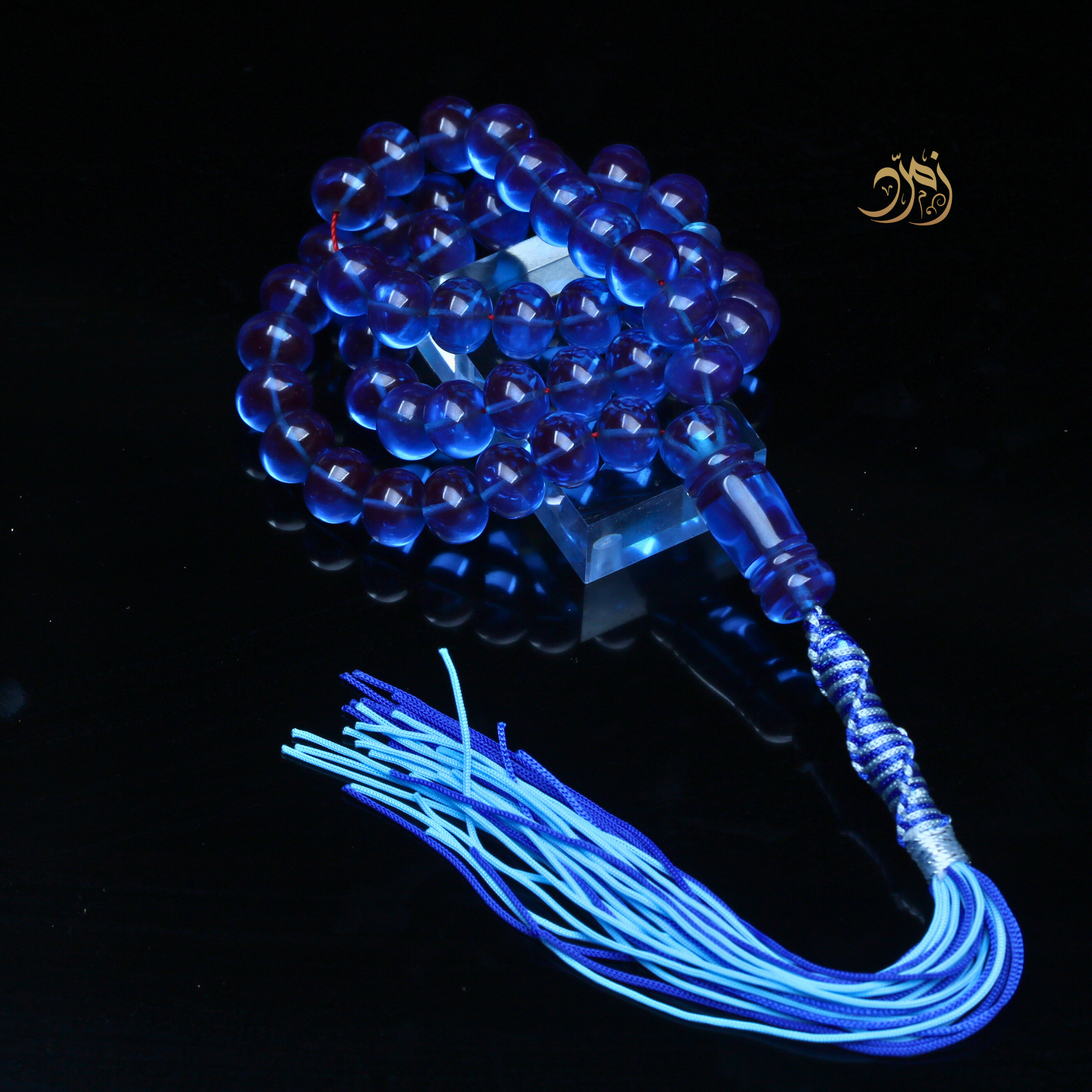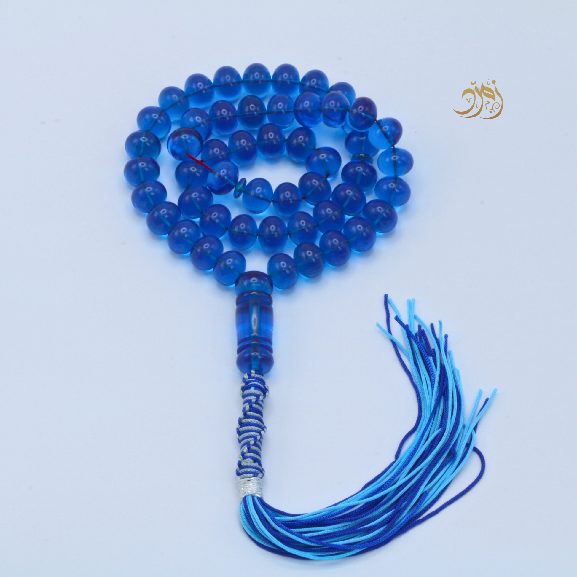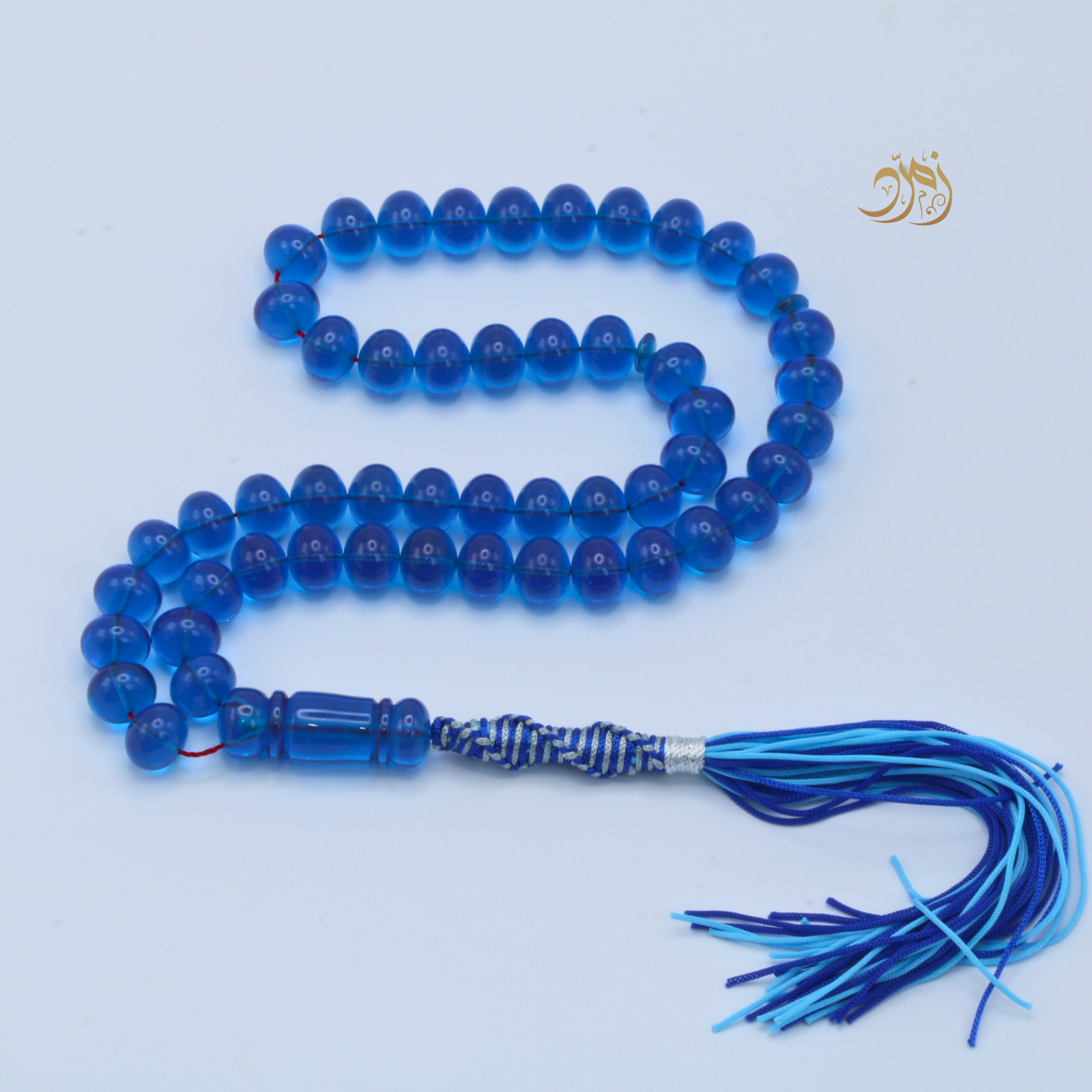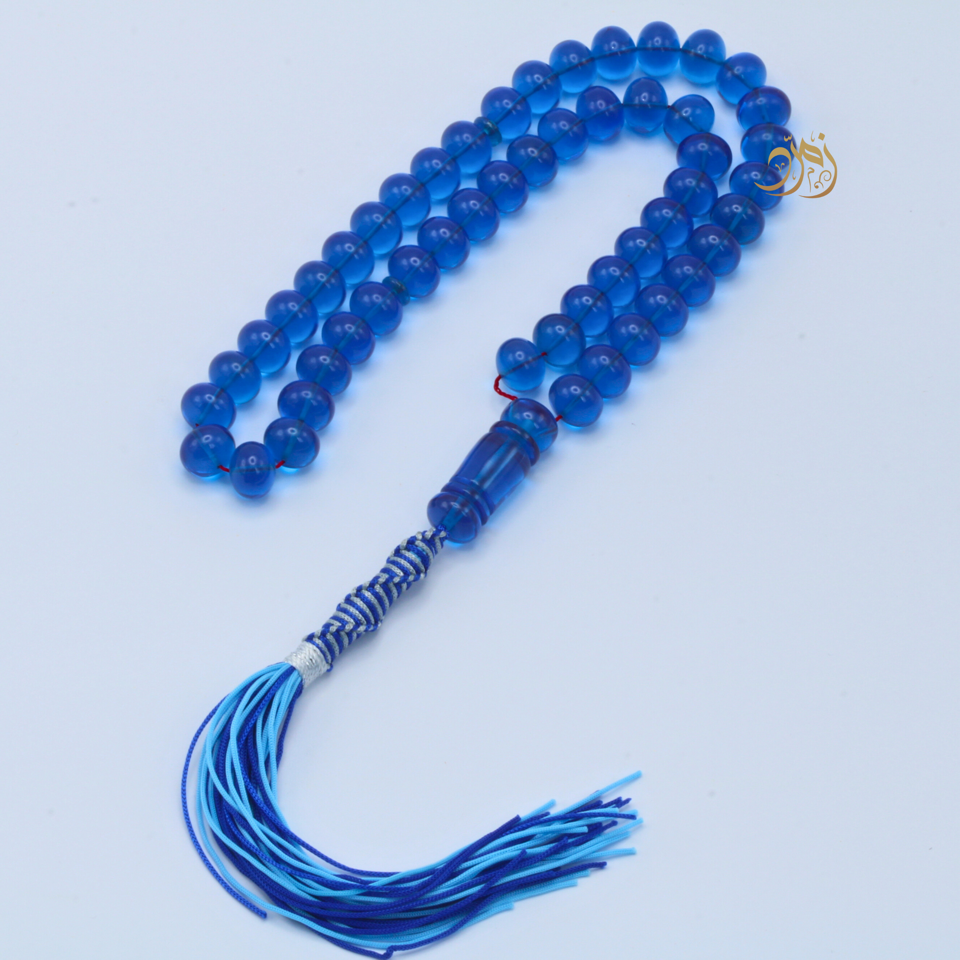 سبحة أنيقة من خامة "الفاتوران المصنّع"، بخراطة متقنة من ورشة لبابيدي المشهورة بحرفيّتها وجودتها العالية. تتكوّن من 51 خرزة بشكل ذروي بلون أزرق شفاف جذاب، تعكس الضوء بطريقة ساحرة وتمنح السبحة حضورًا بصريًا فخمًا. ، وتُزين السبحة كركوشه فاخرة بدرجات الأزرق تضيف لمسة من الأناقة والتميز.