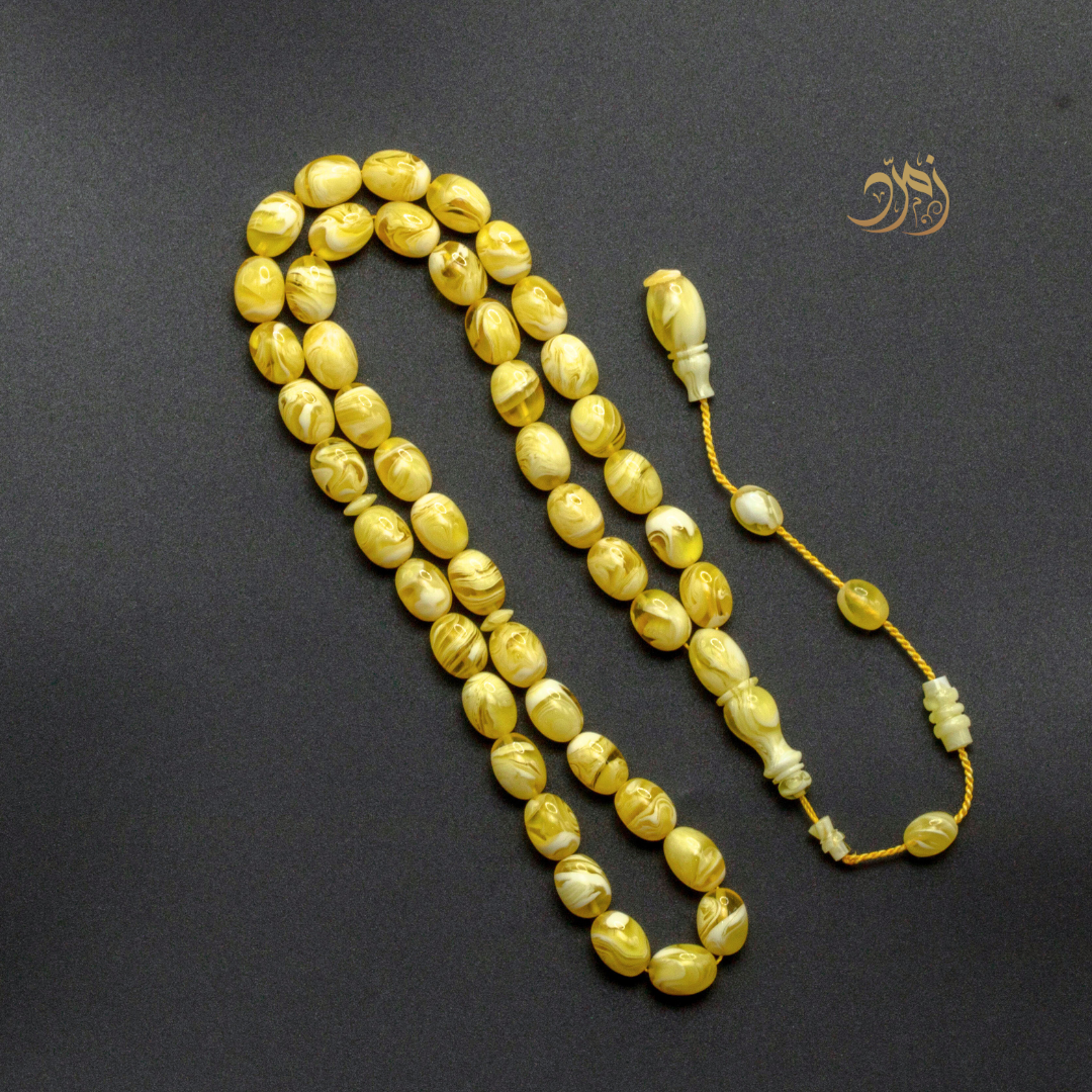 سبحة بخامة مستكة فواحة بلون أصفر مموج طبيعي، تجمع بين الأناقة والرائحة العطرية المميزة، لتمنحك تجربة فريدة تجمع بين الجمال والروحانية.
