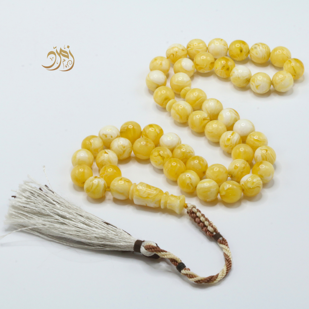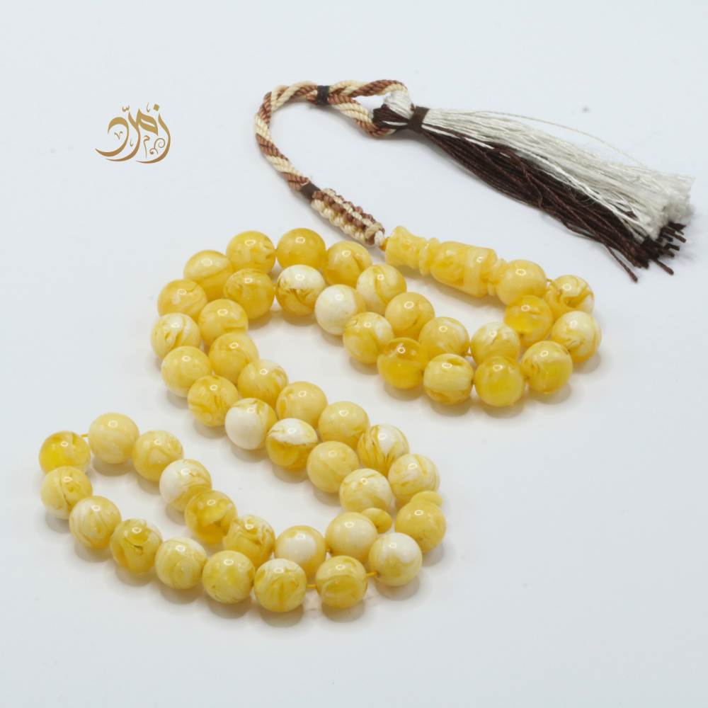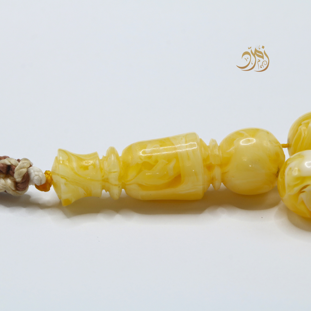 سبحة فاخرة مصنوعة من خامة مستكة بلون "قشطة وعسل"، تجمع بين درجات البيج والذهبي الفاتح بانسجام ناعم ومريح للعين.